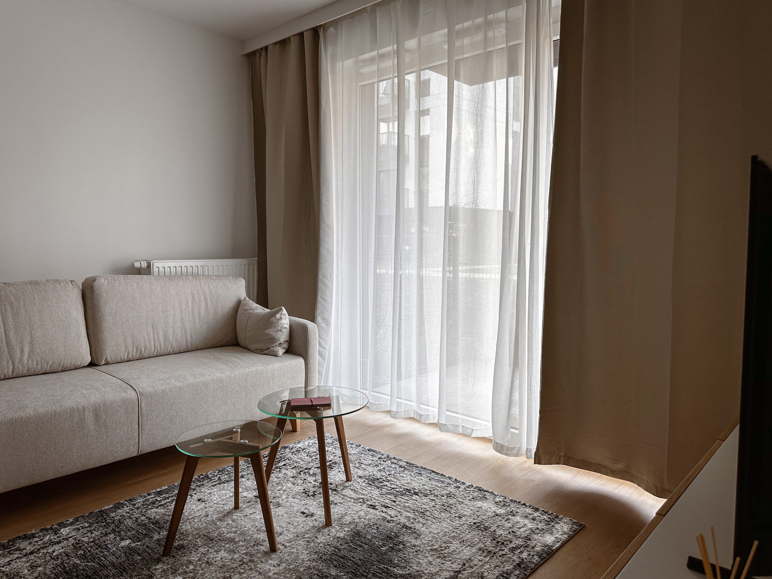 W salonie wygodna kanapa z funkcją spania i pojemnikiem na pościel.
