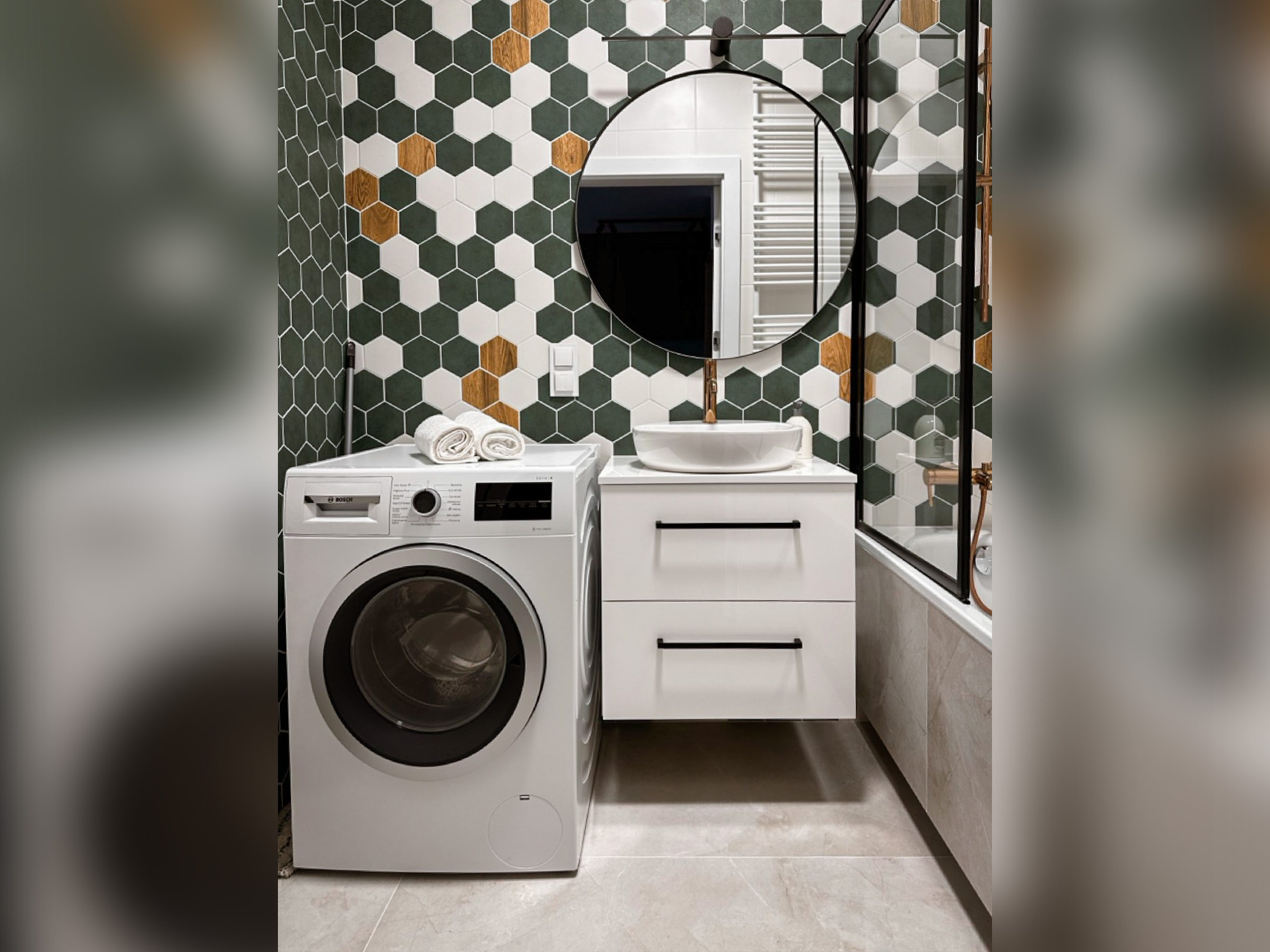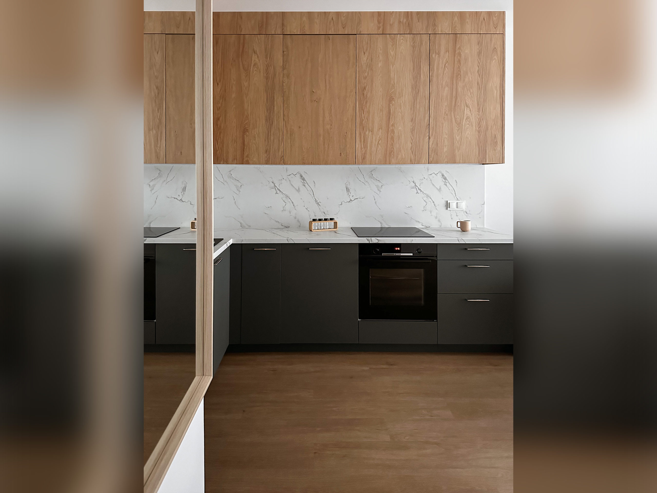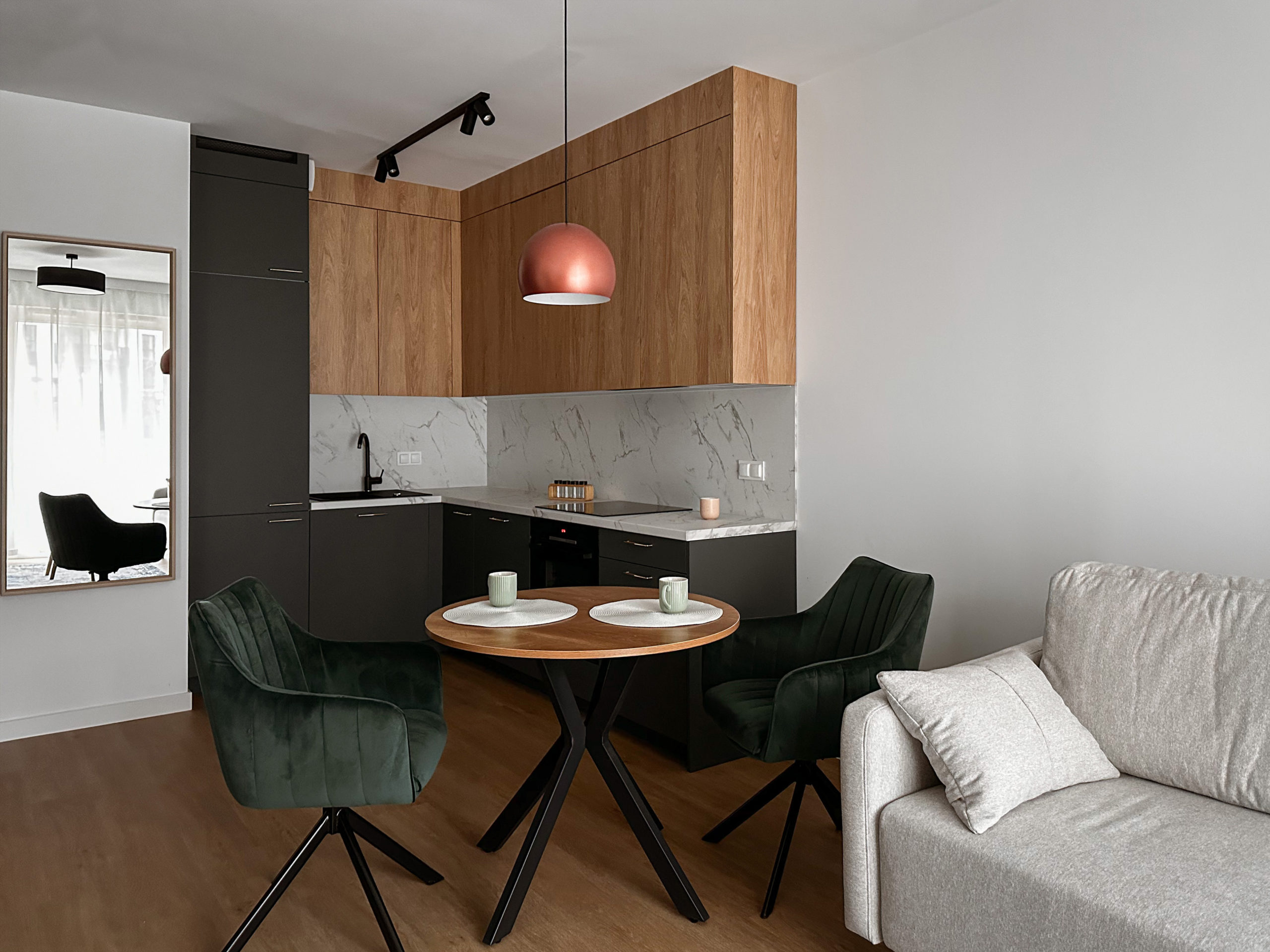 Gustownie urządzone z wykorzystaniem wysokiej jakości materiałów, zabudowa AGD Bosch, zlew i bateria Franke.