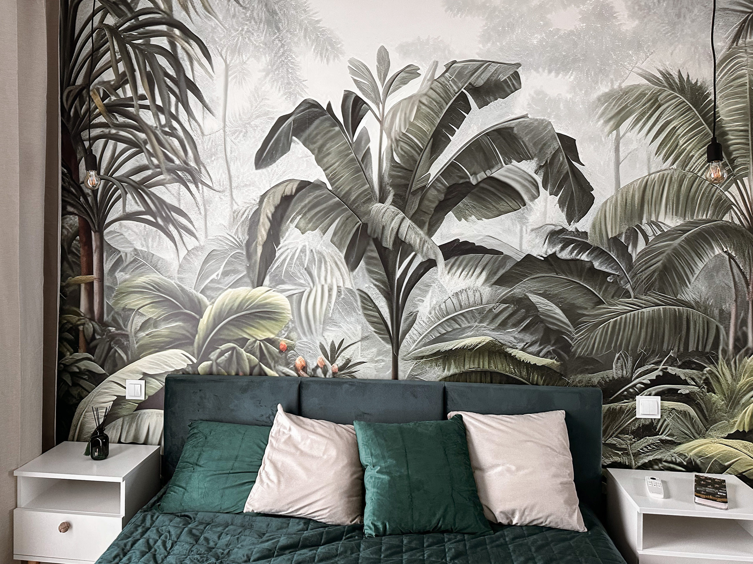 W sypialni wygodne łóżko z pojemnikiem na pościel wentylator zapewniający chłód w upalne dni (z opcją zmiany barwy światła) oraz przestronna szafa.