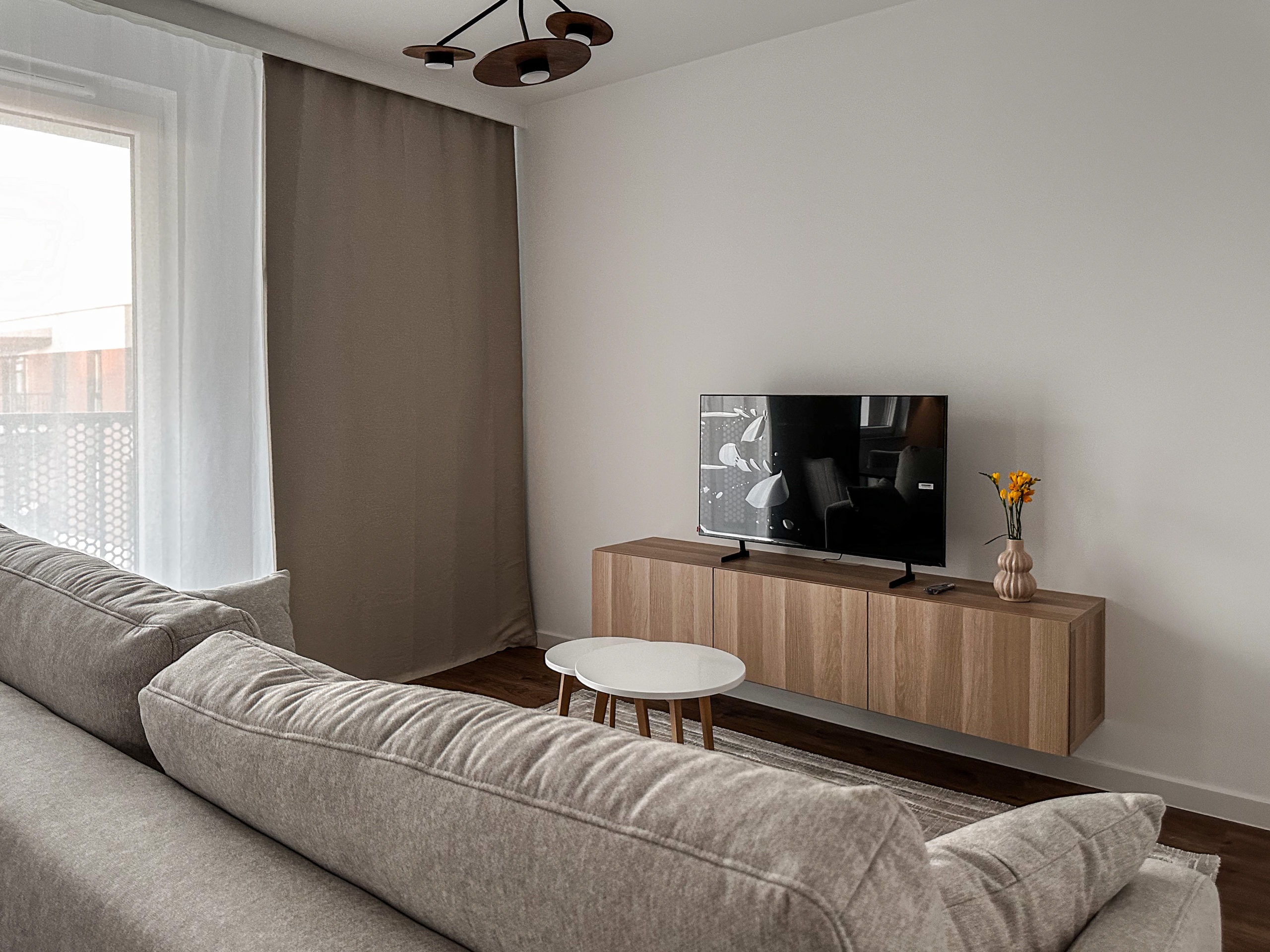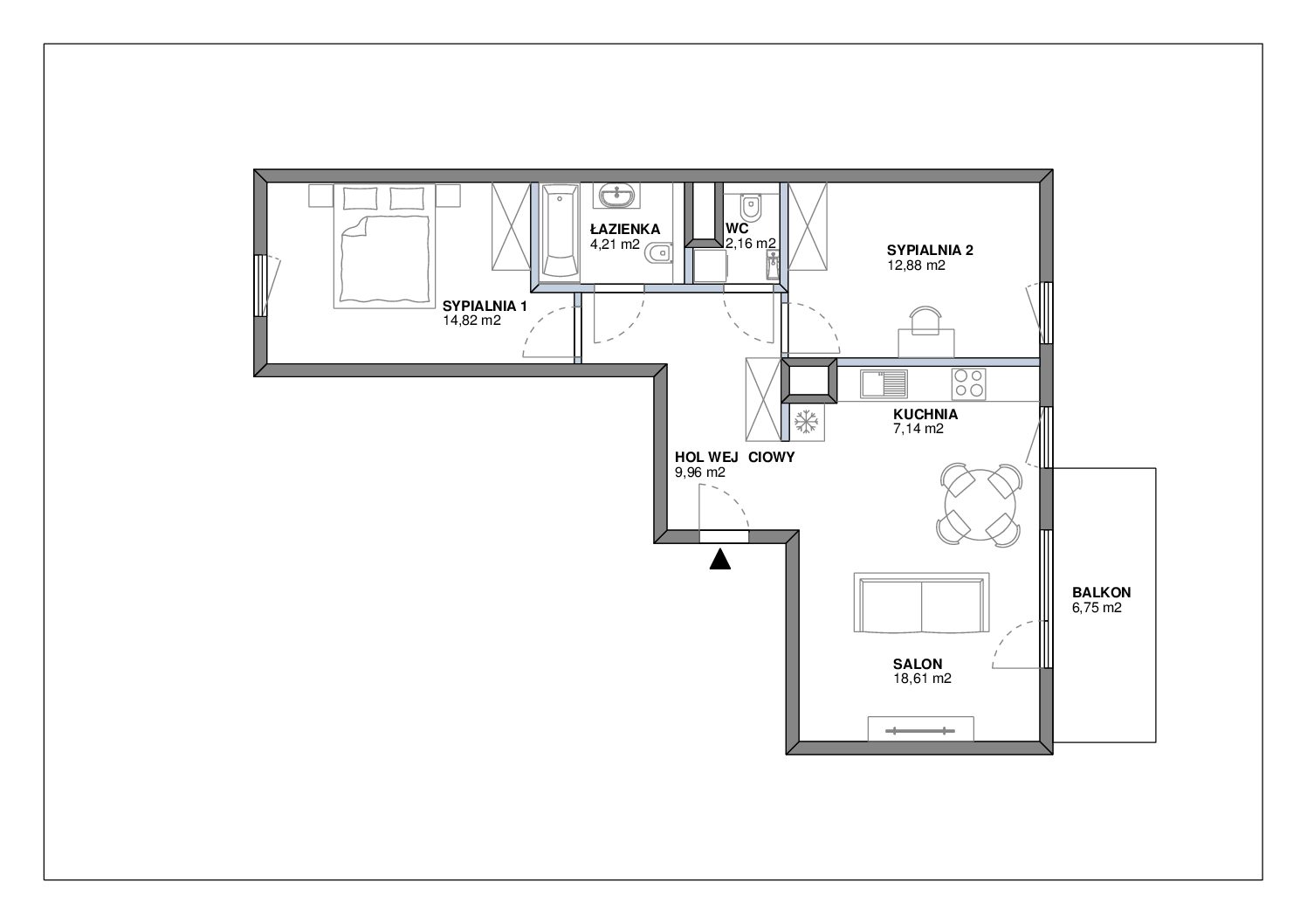 Mieszkanie składa się z salonu z aneksem kuchennym, sypialni, pokoju oraz 2 łazienek.