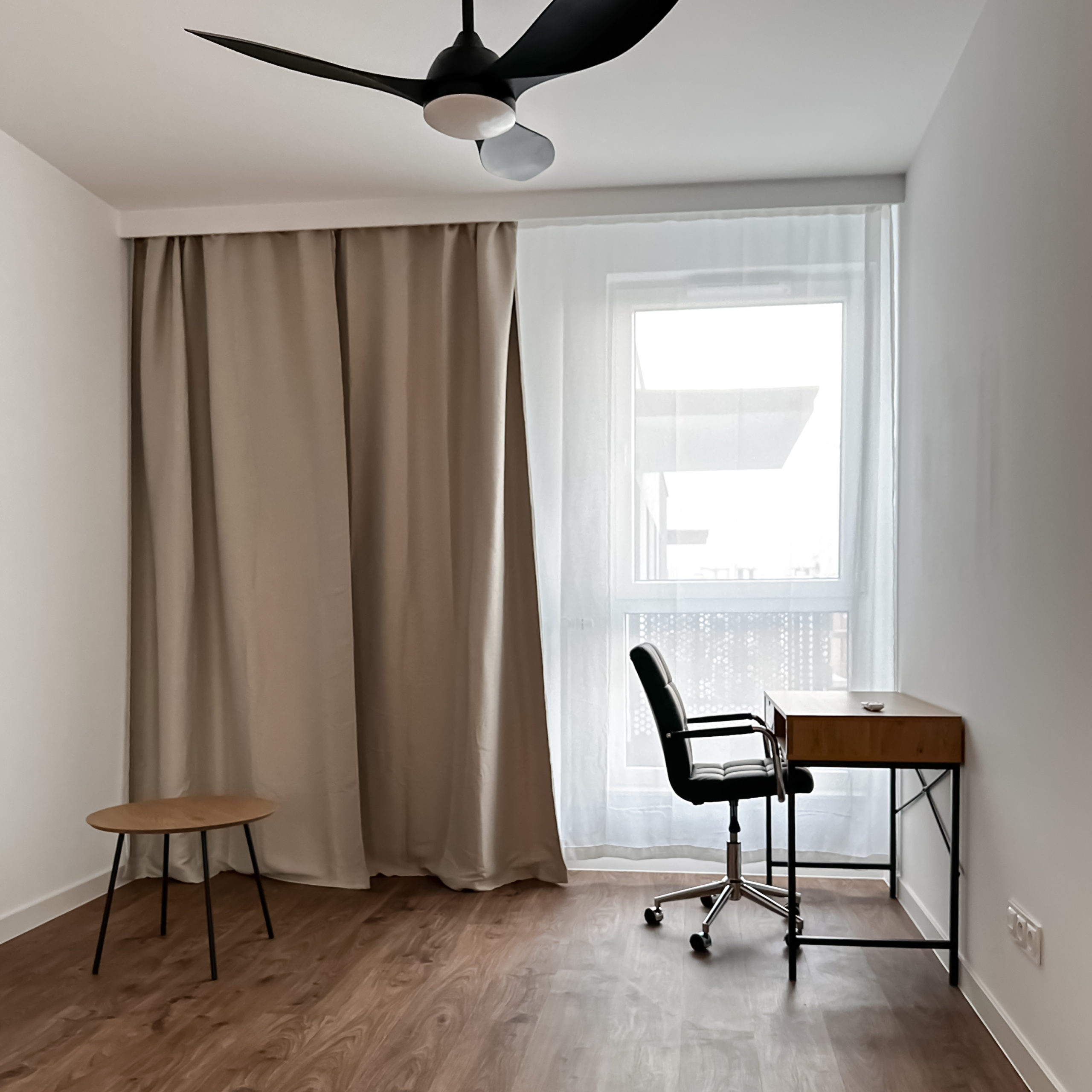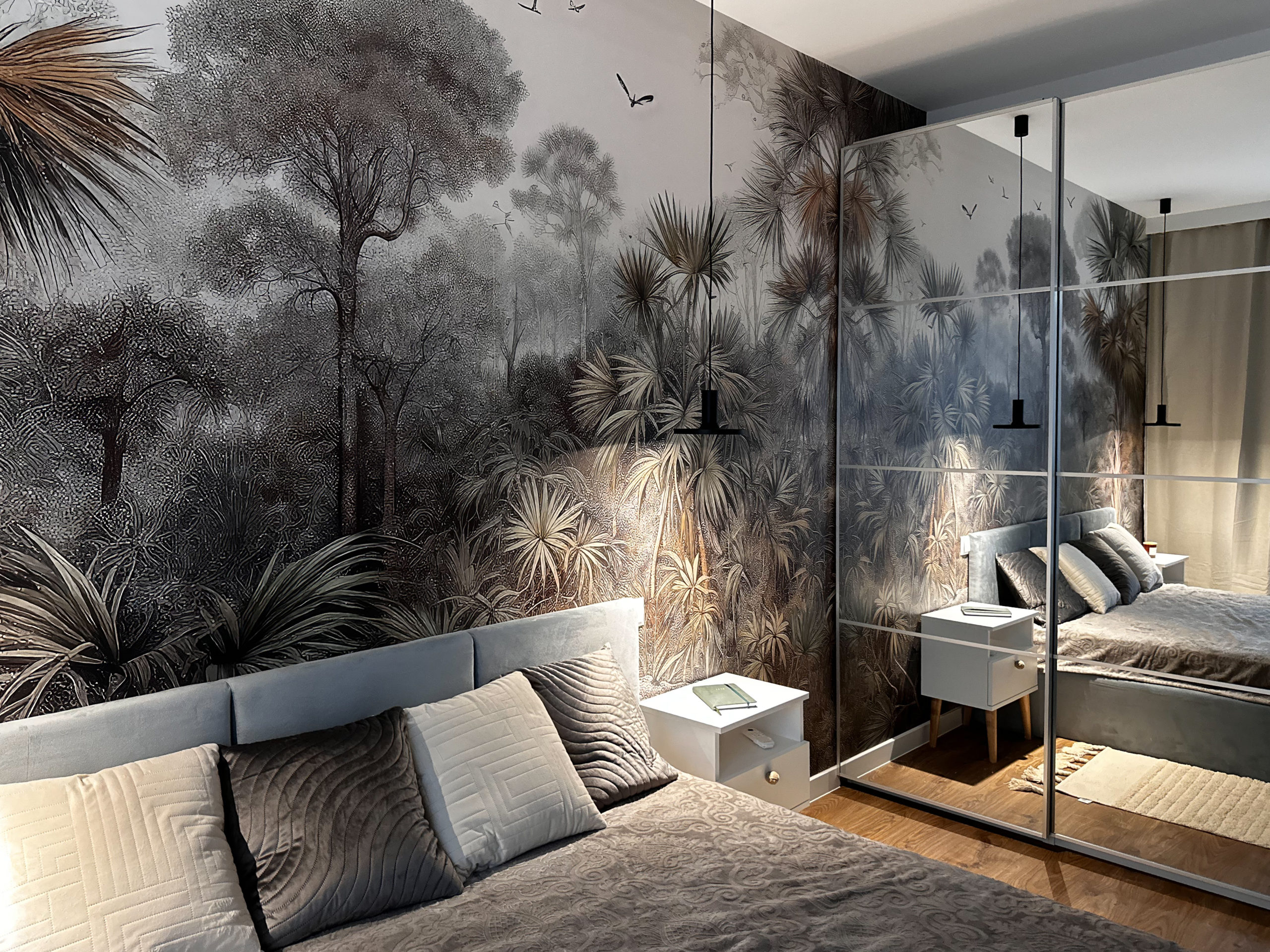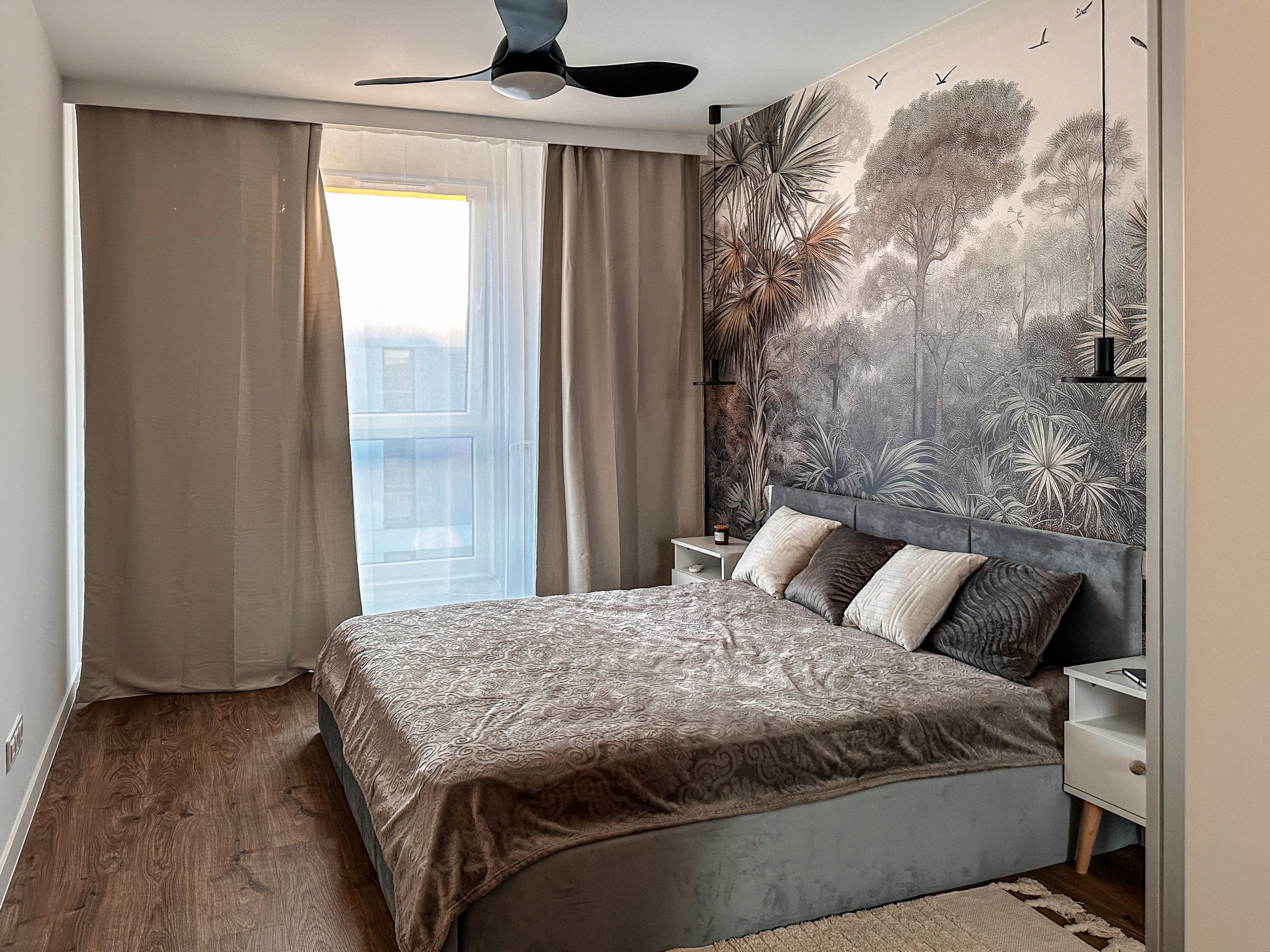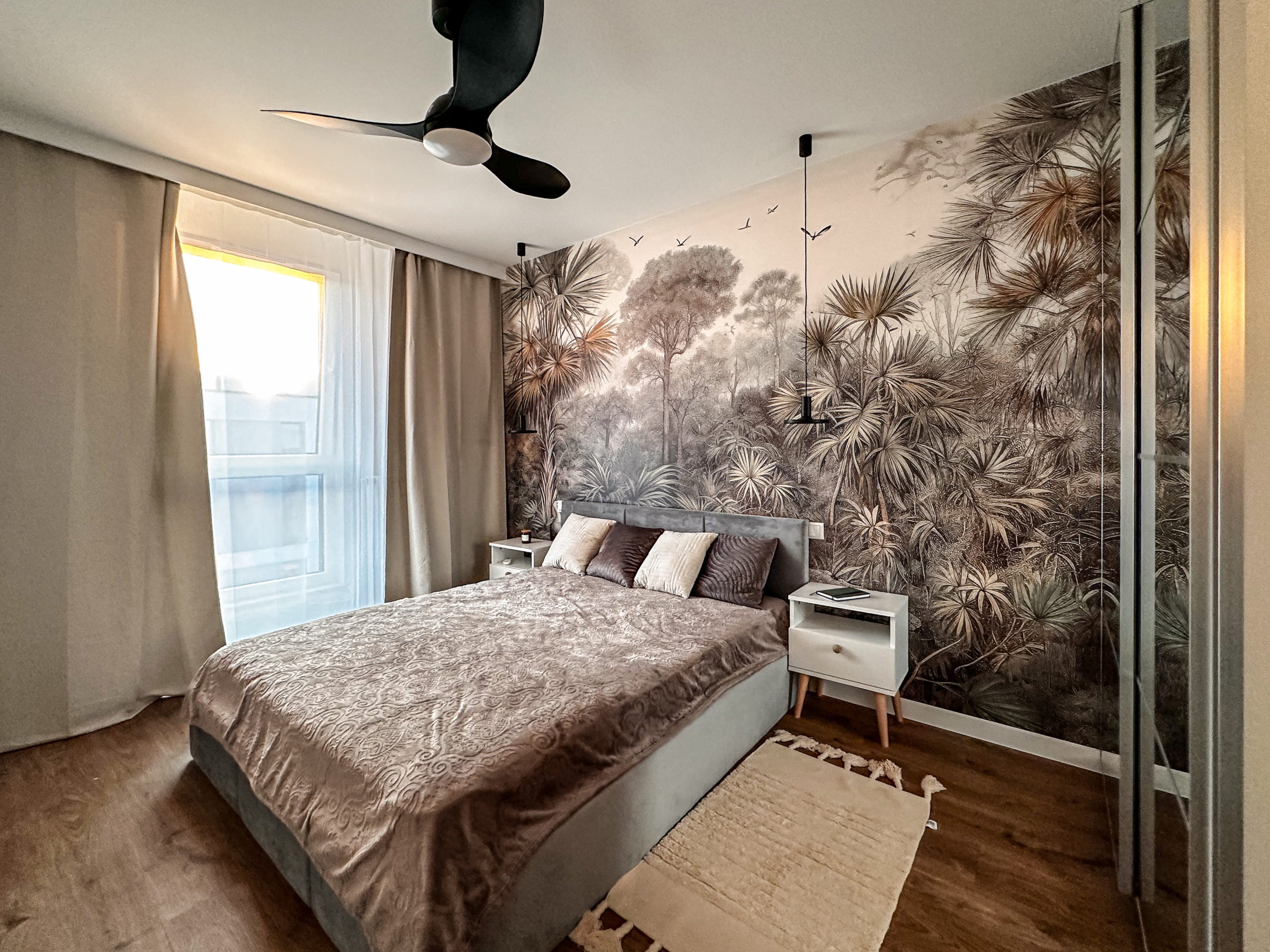 W obu sypialniach wygodne podwójne łóżko o wymiarach 160x200cm , z pojemnikiem na pościel, wentylator zapewniający chłód w upalne dni (z opcją zmiany barwy światła) oraz przestronna szafa.