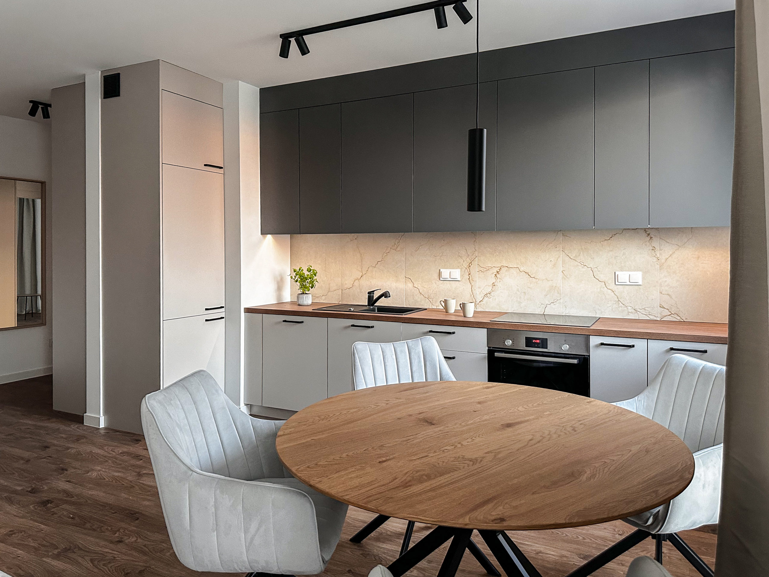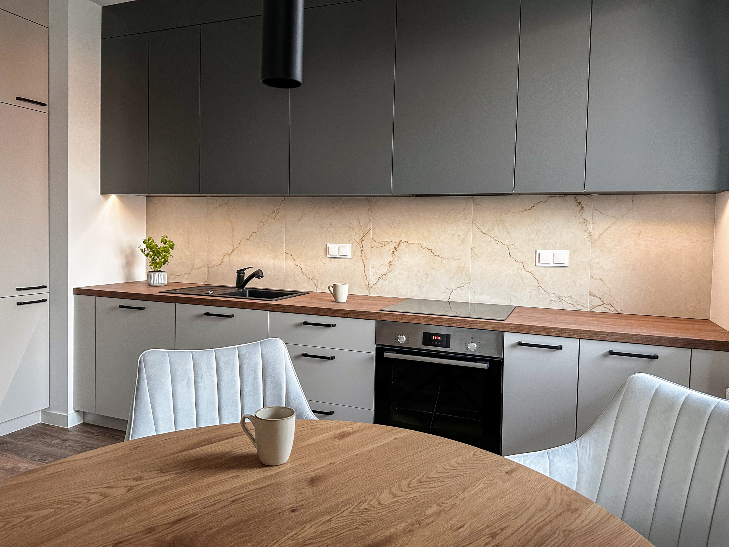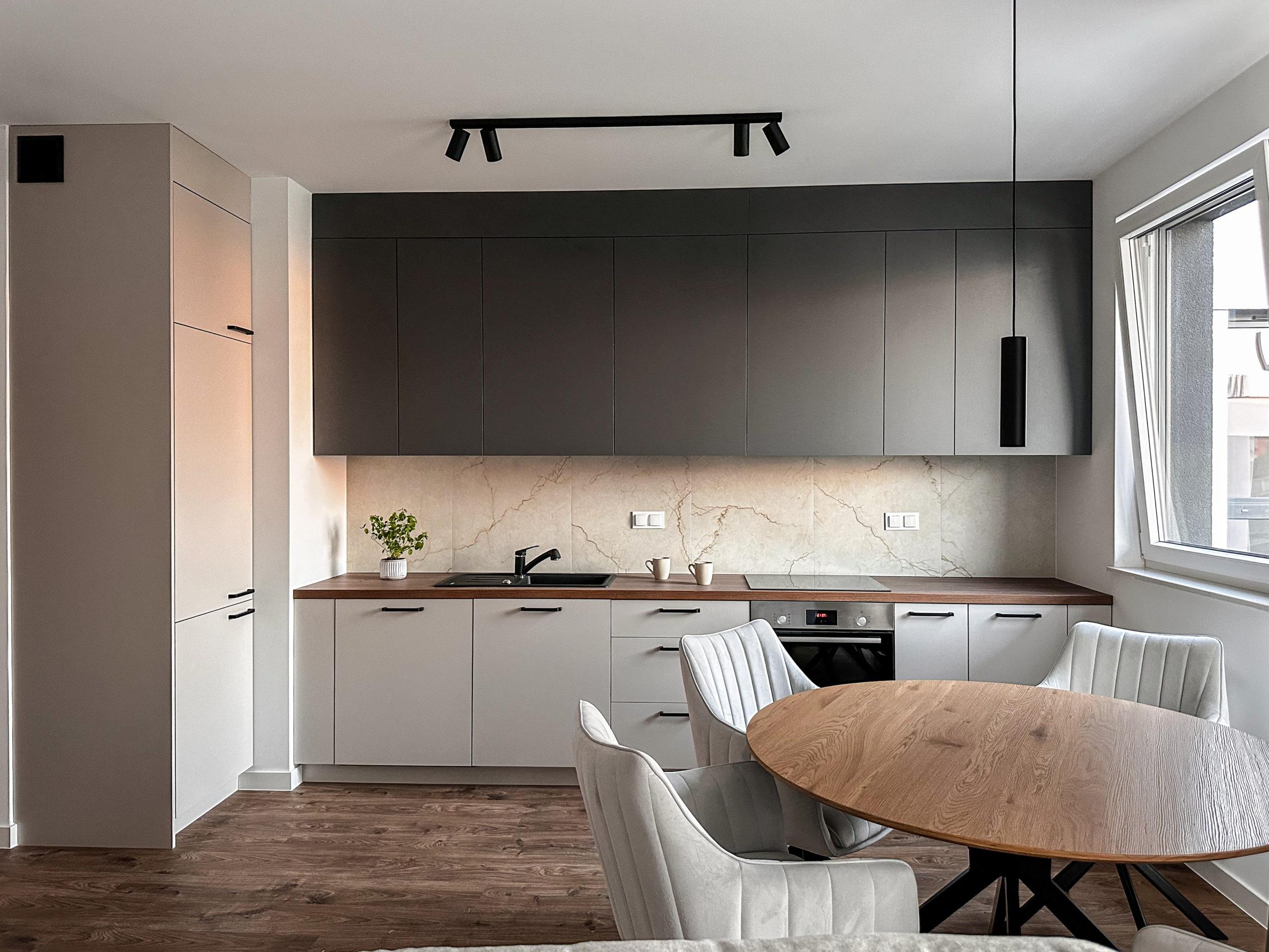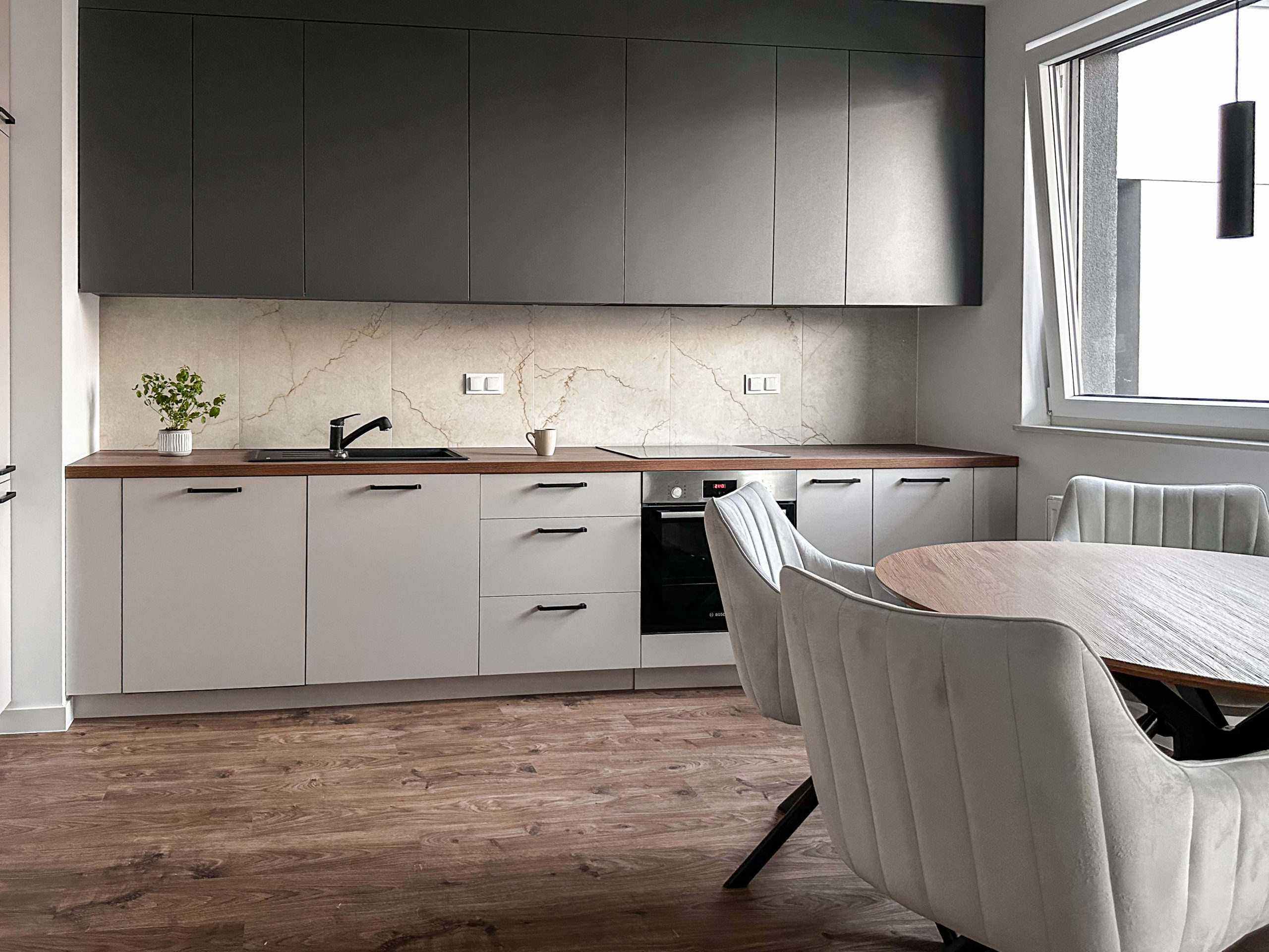 Gustownie urządzone z wykorzystaniem wysokiej jakości materiałów, zabudowa AGD Bosch, zlew i bateria Franke.