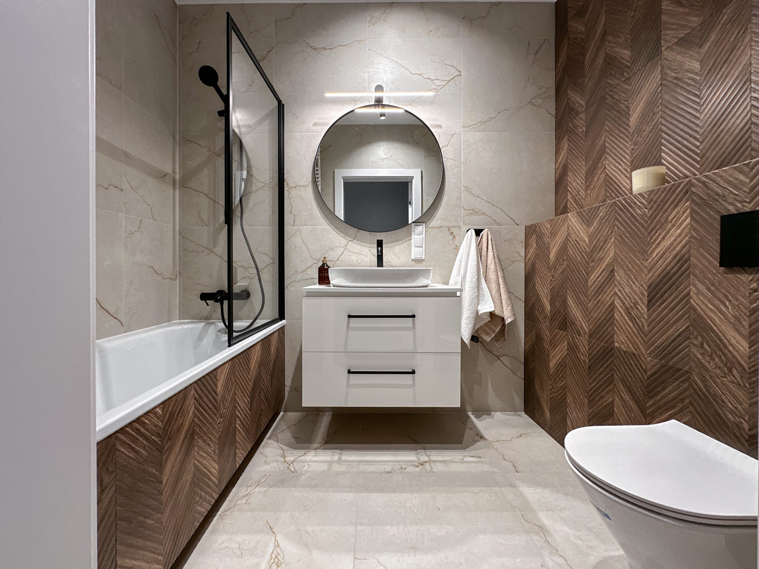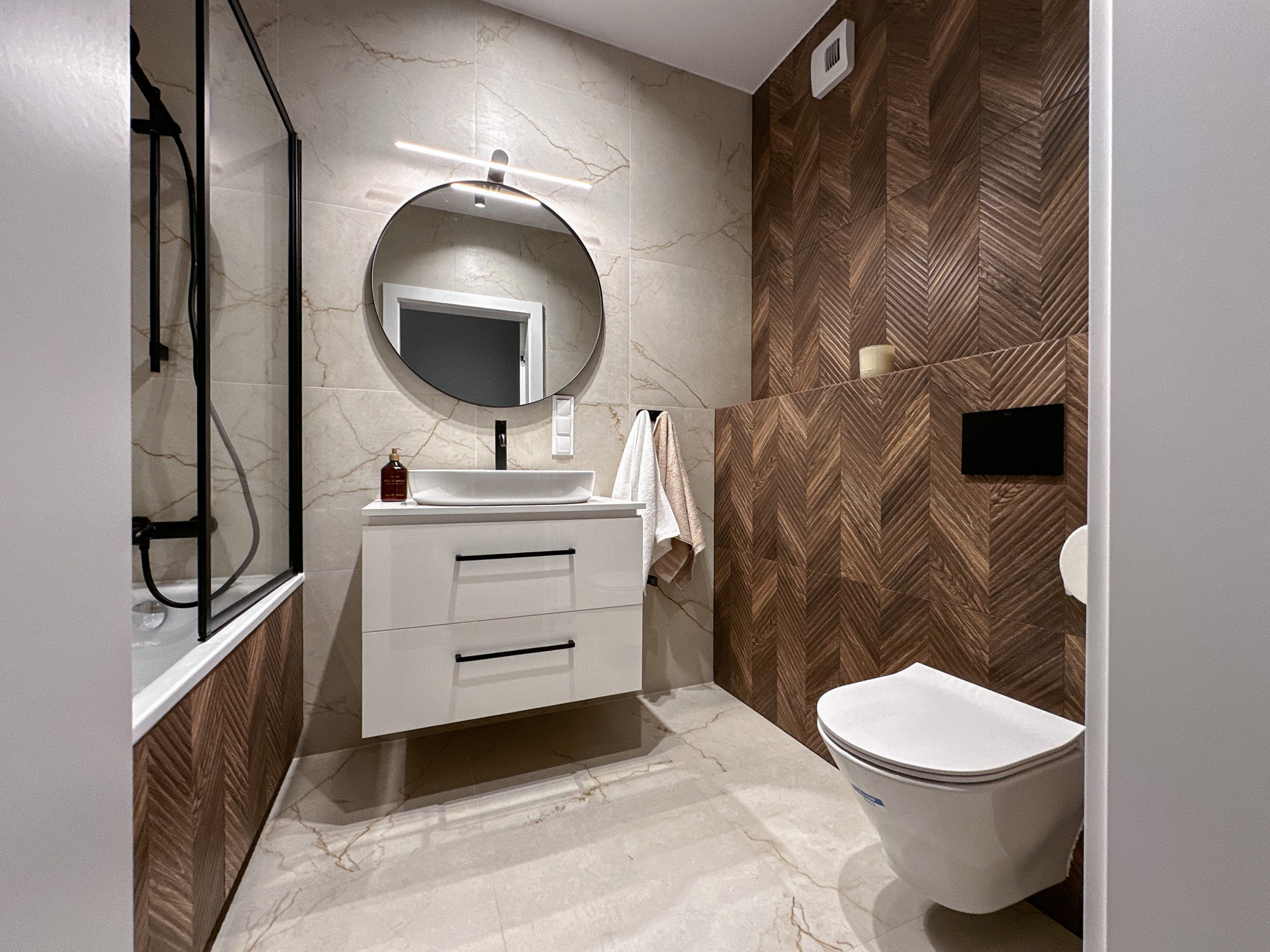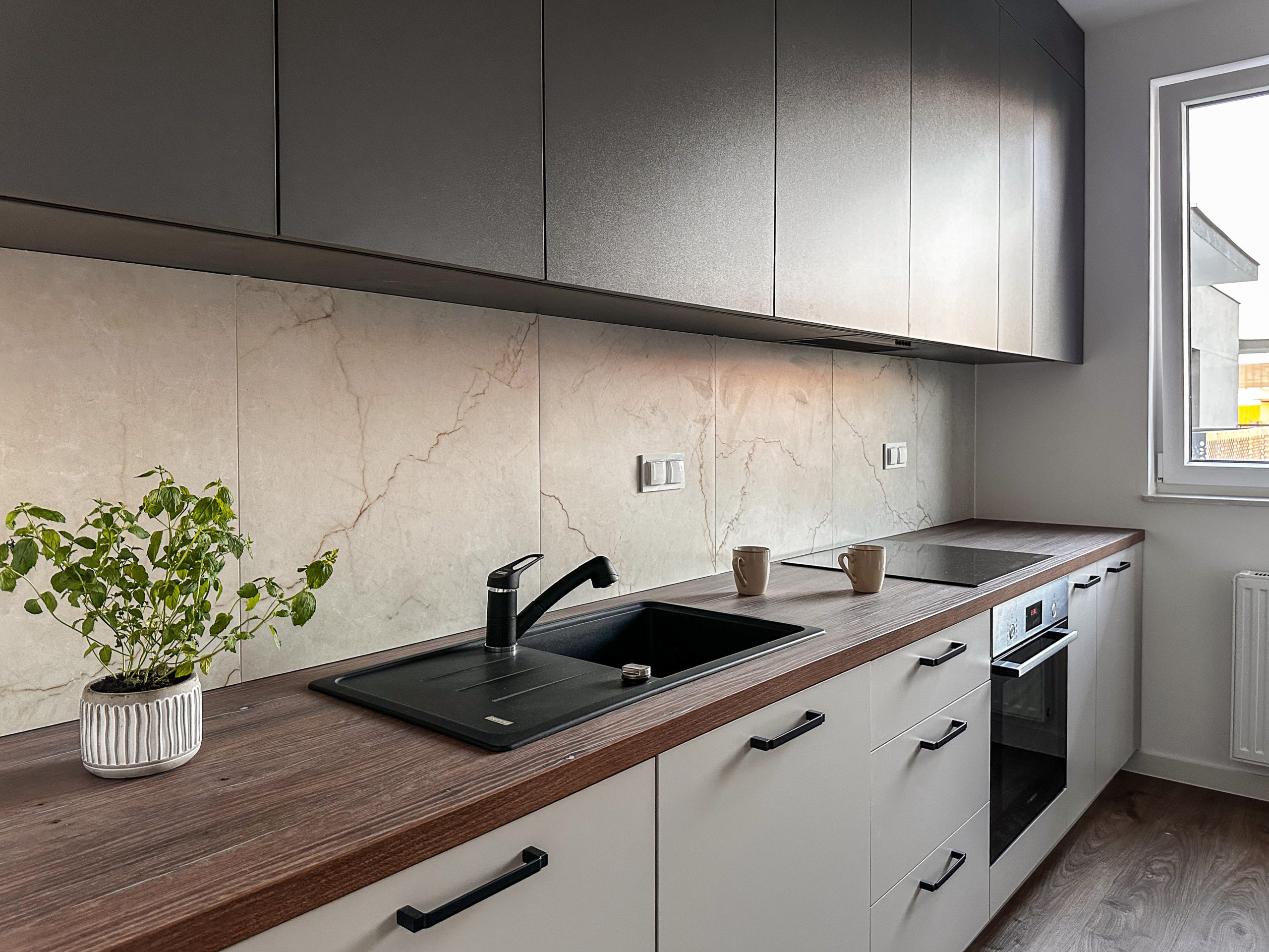Gustownie urządzone z wykorzystaniem wysokiej jakości materiałów, zabudowa AGD Bosch, zlew i bateria Franke.