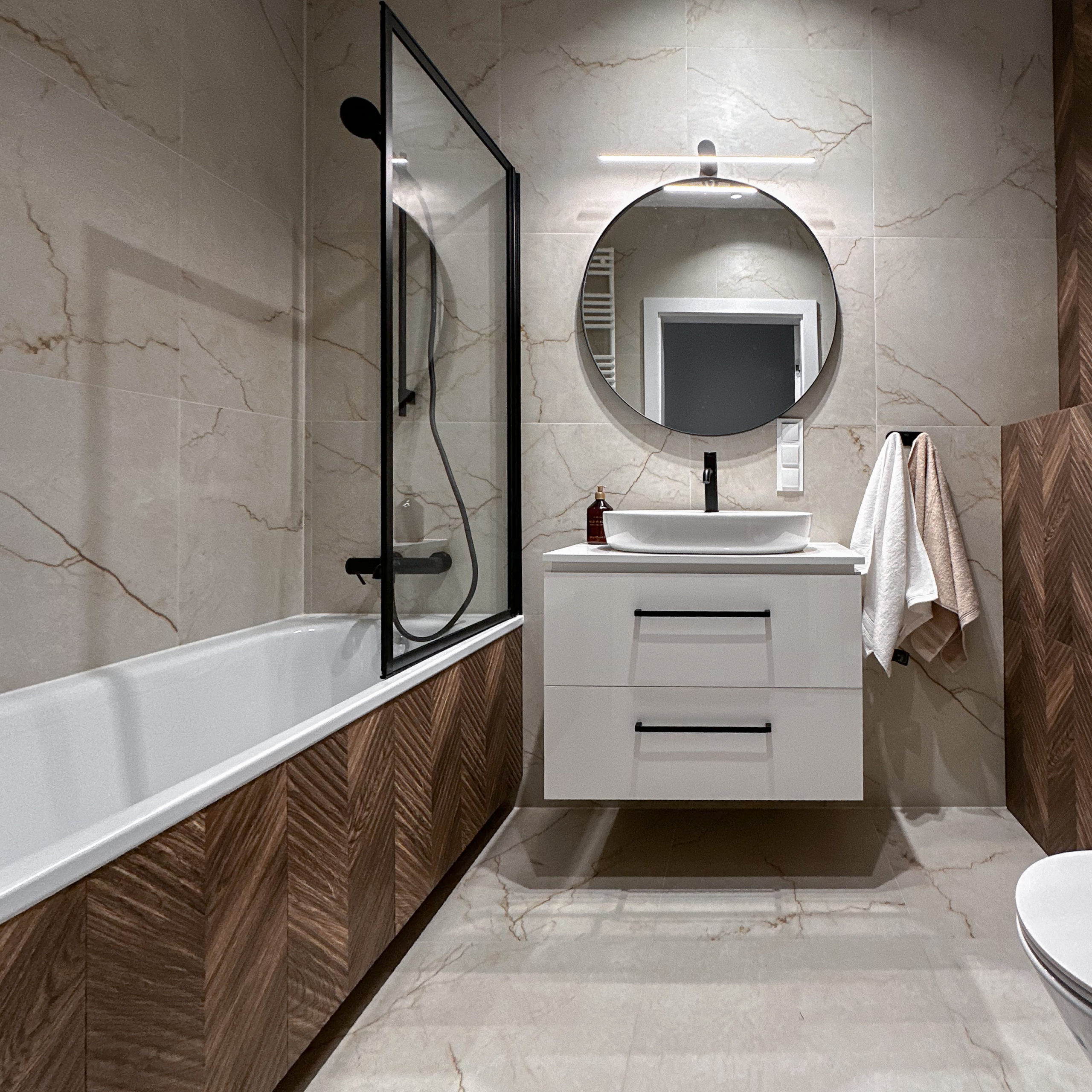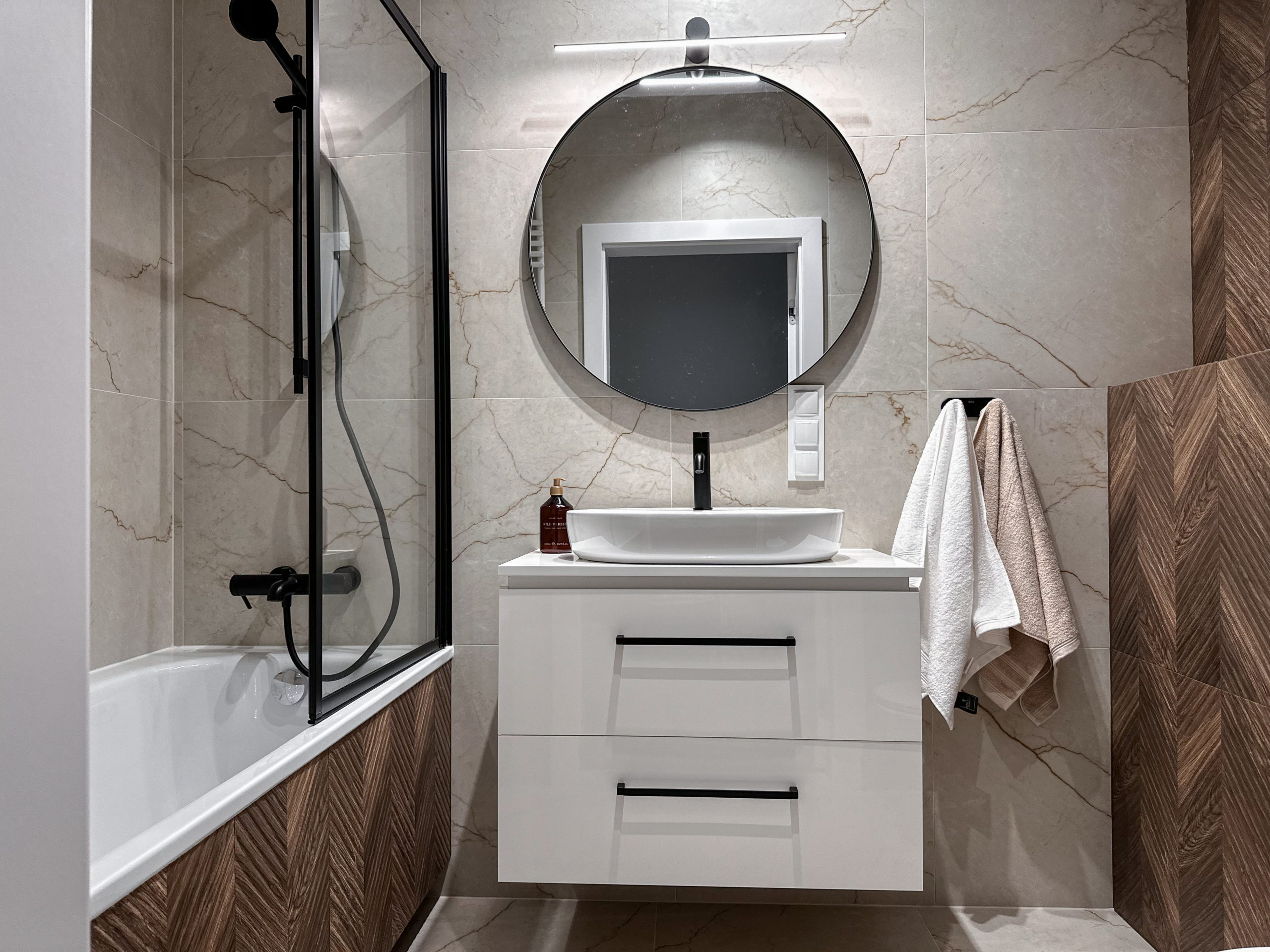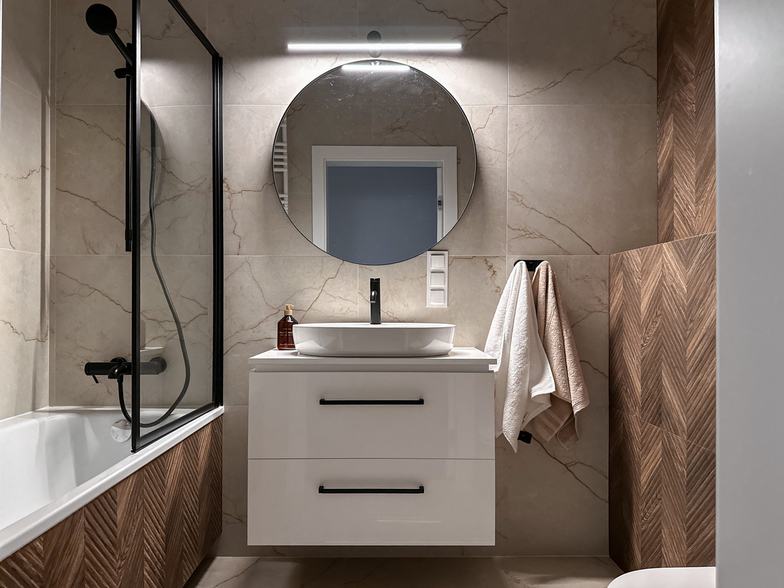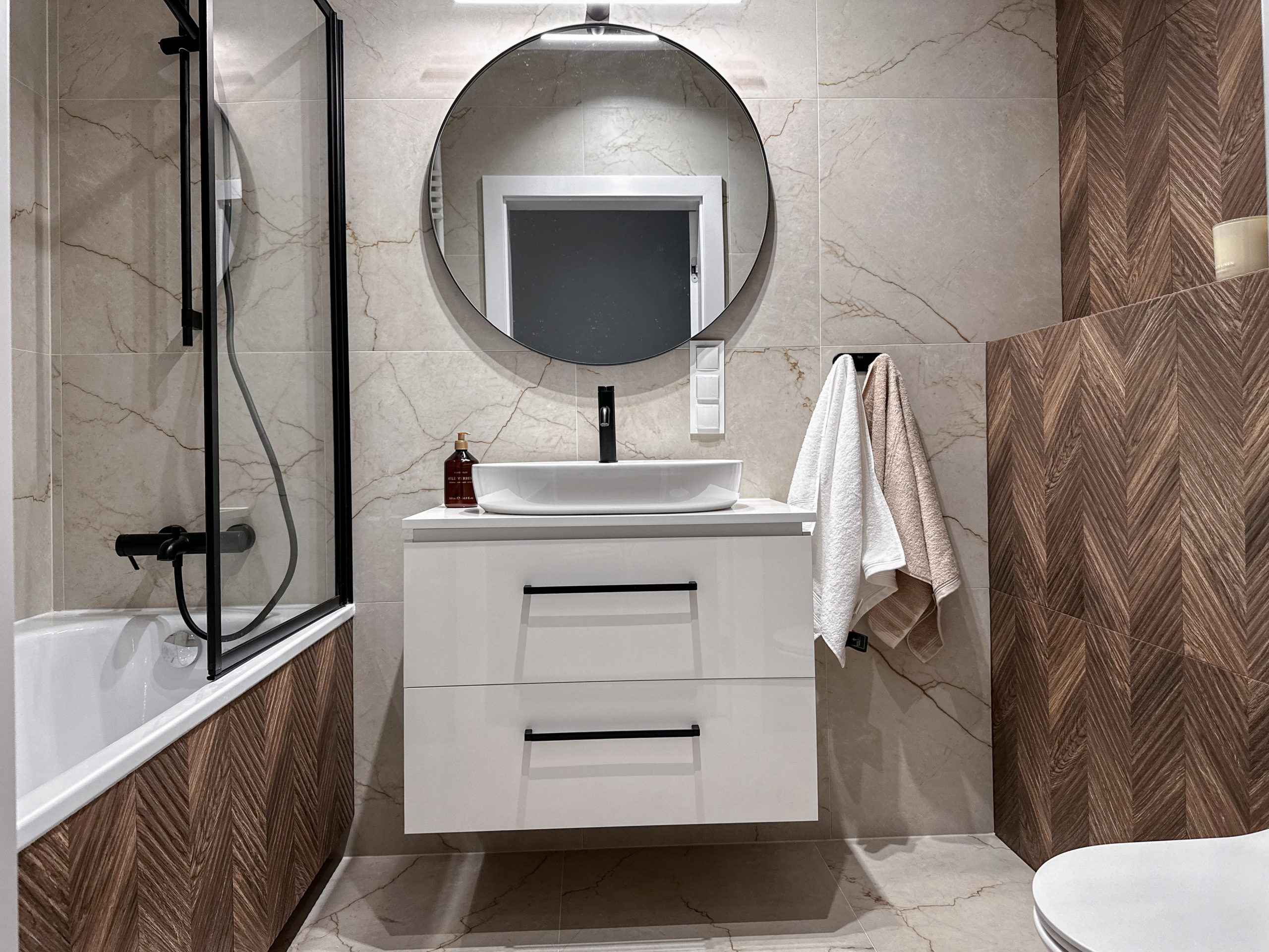 Gustownie urządzone z wykorzystaniem wysokiej jakości materiałów, zabudowa AGD Bosch, zlew i bateria Franke.