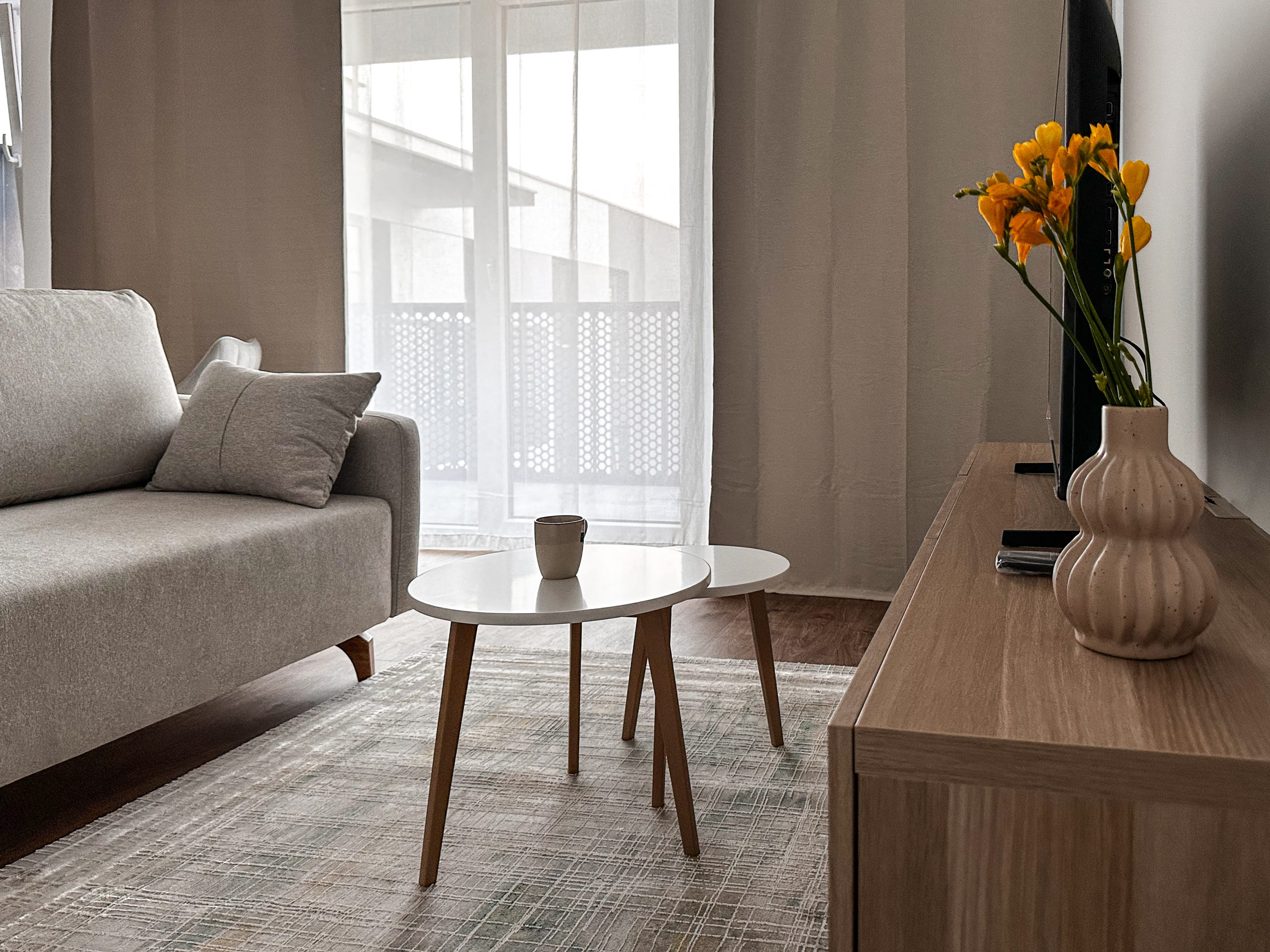 W salonie wygodna kanapa z funkcją spania i pojemnikiem na pościel.
