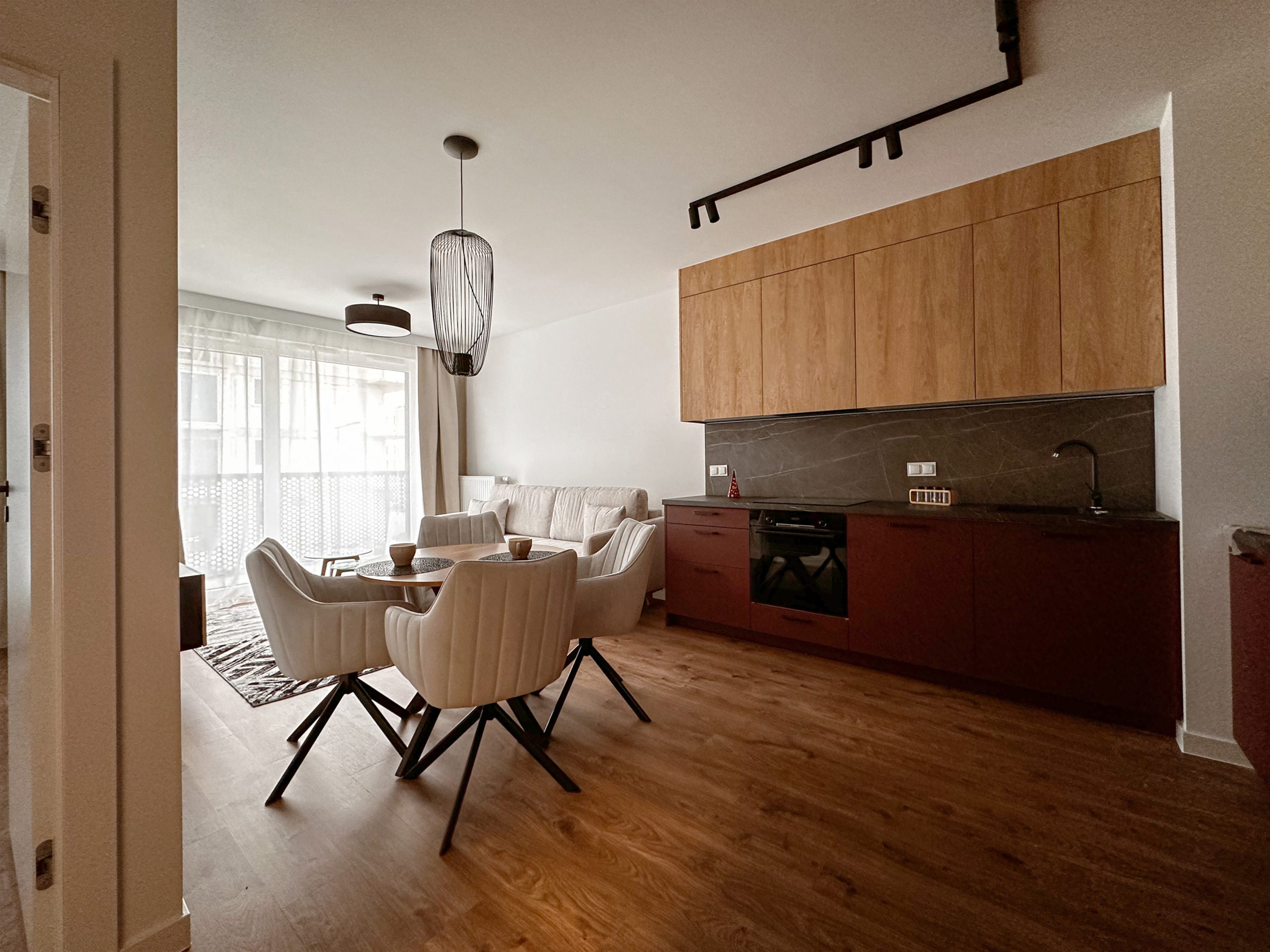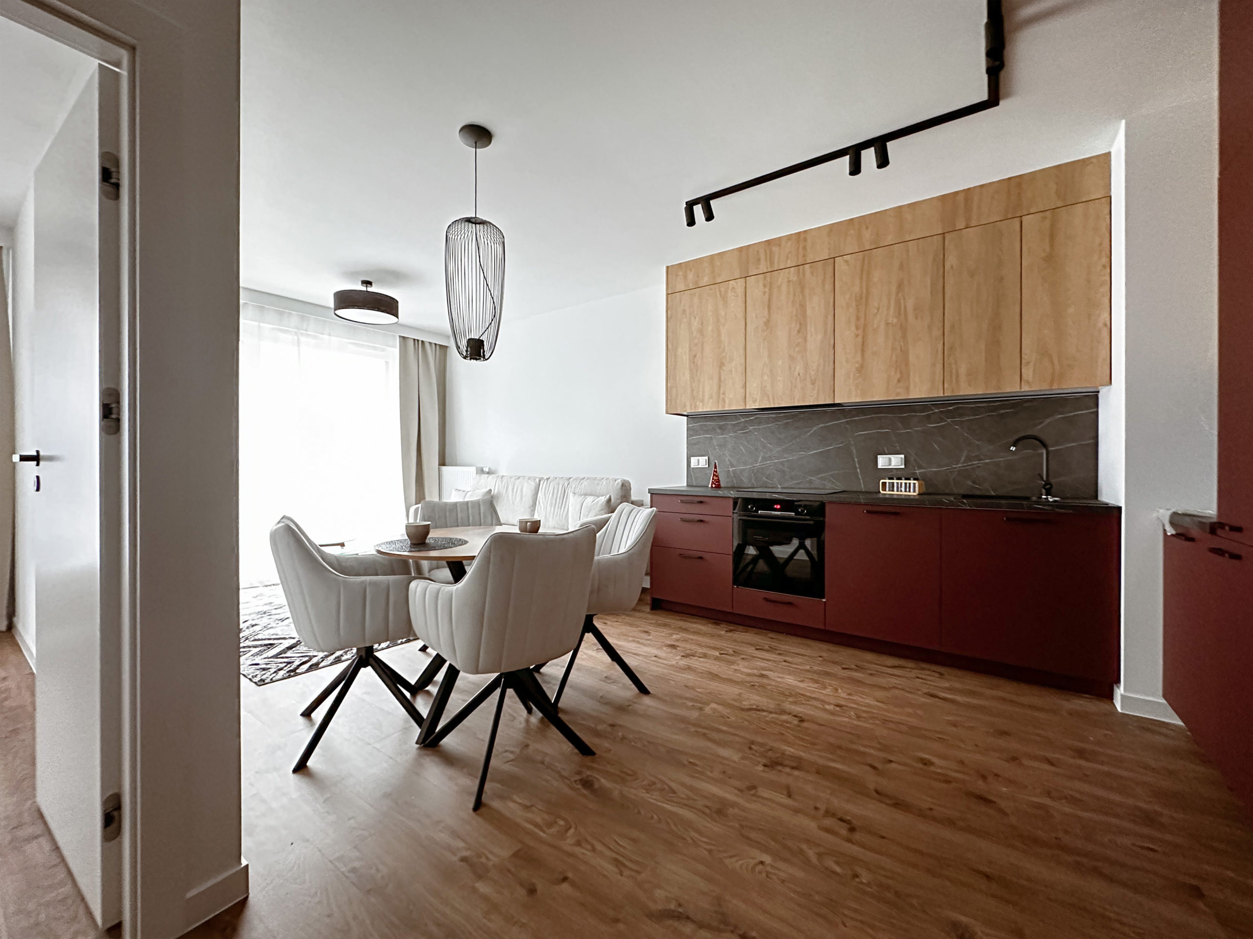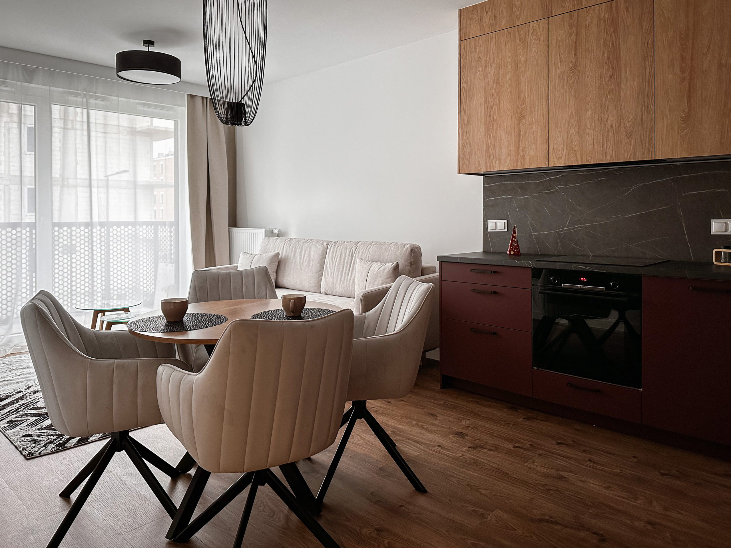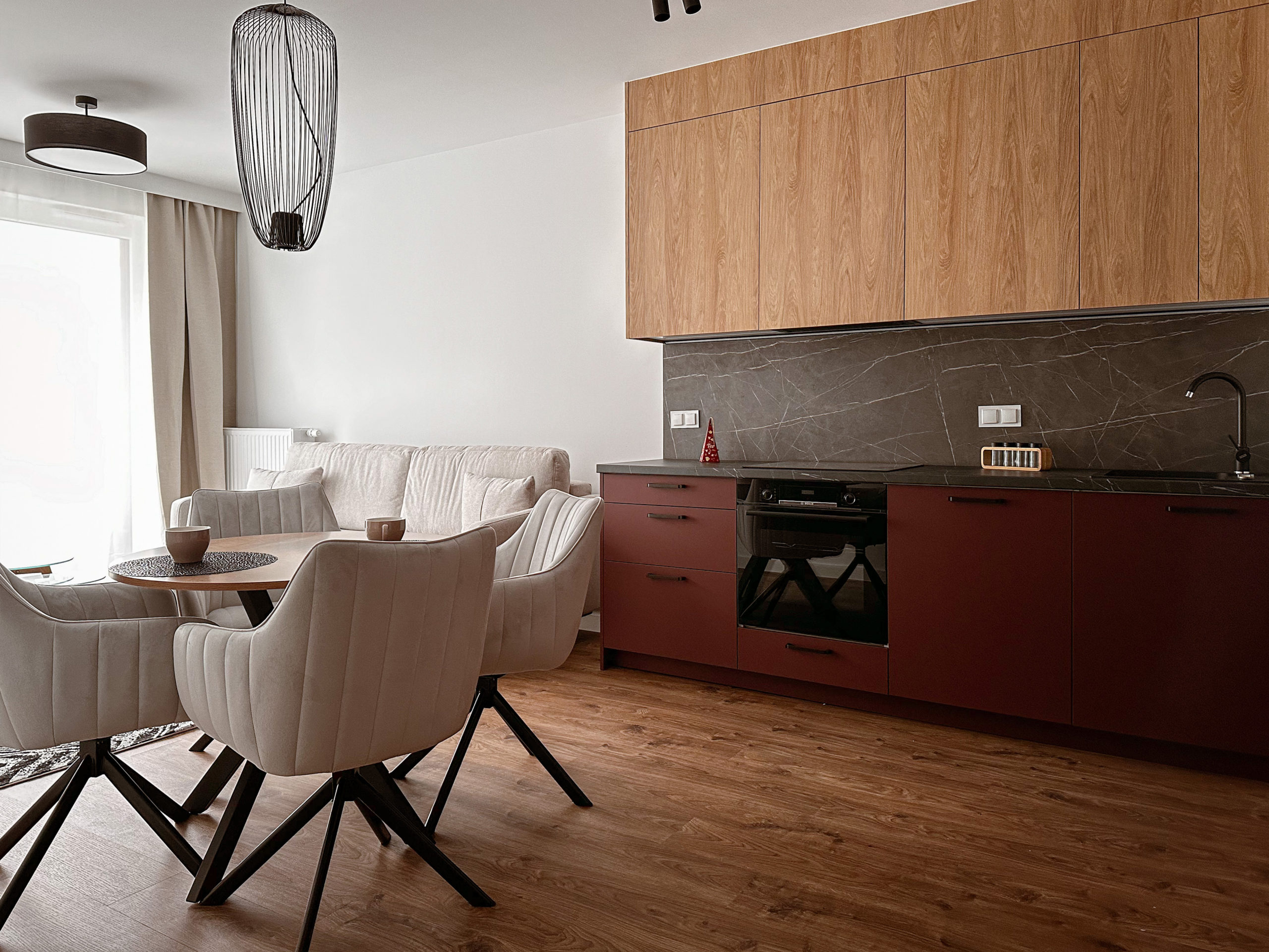 Gustownie urządzone z wykorzystaniem wysokiej jakości materiałów, zabudowa AGD Bosch, zlew Franke.