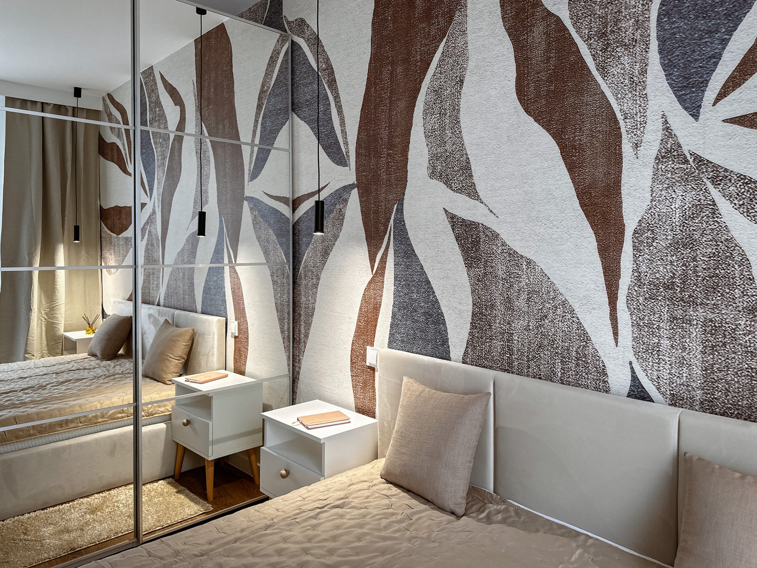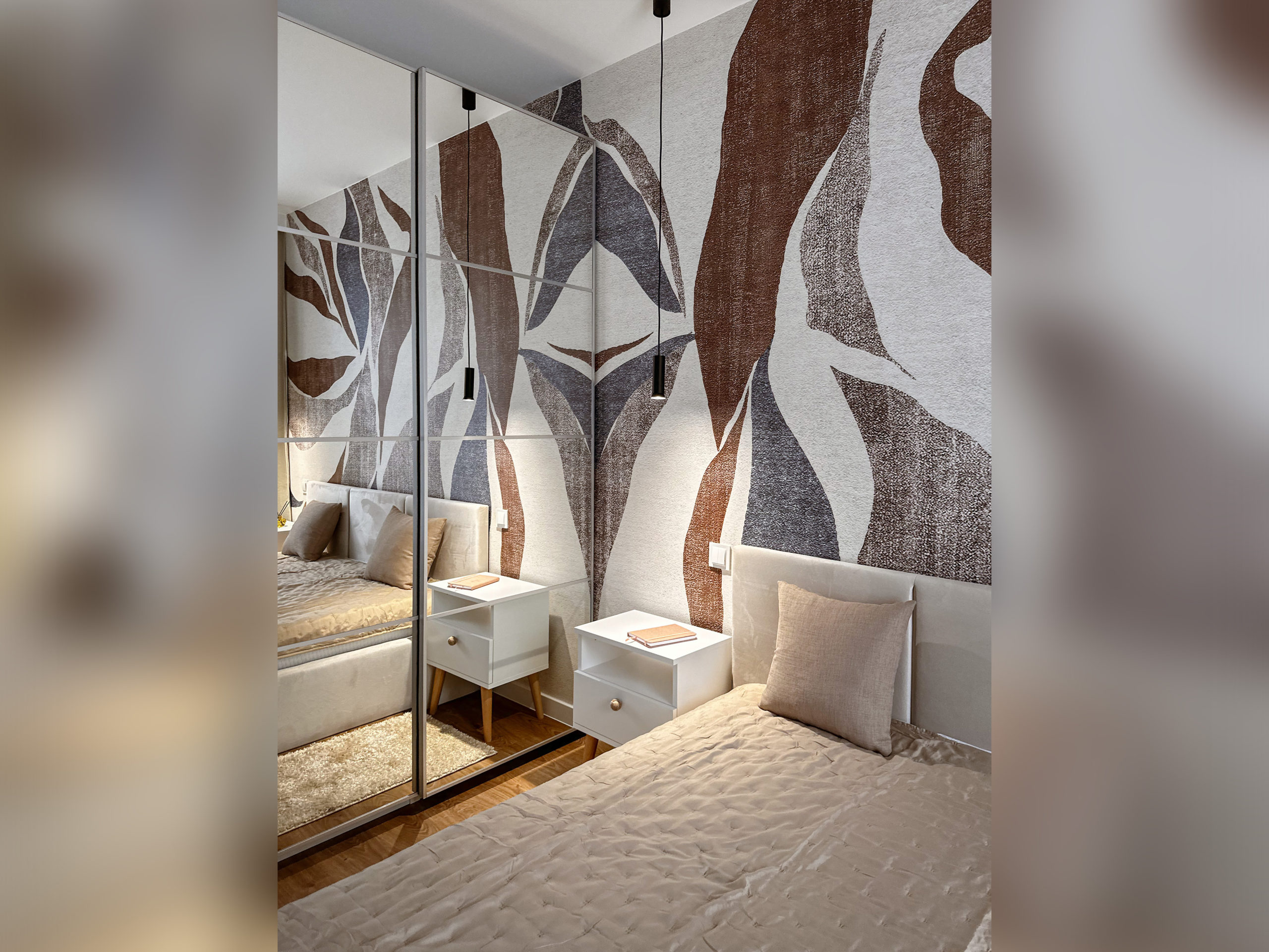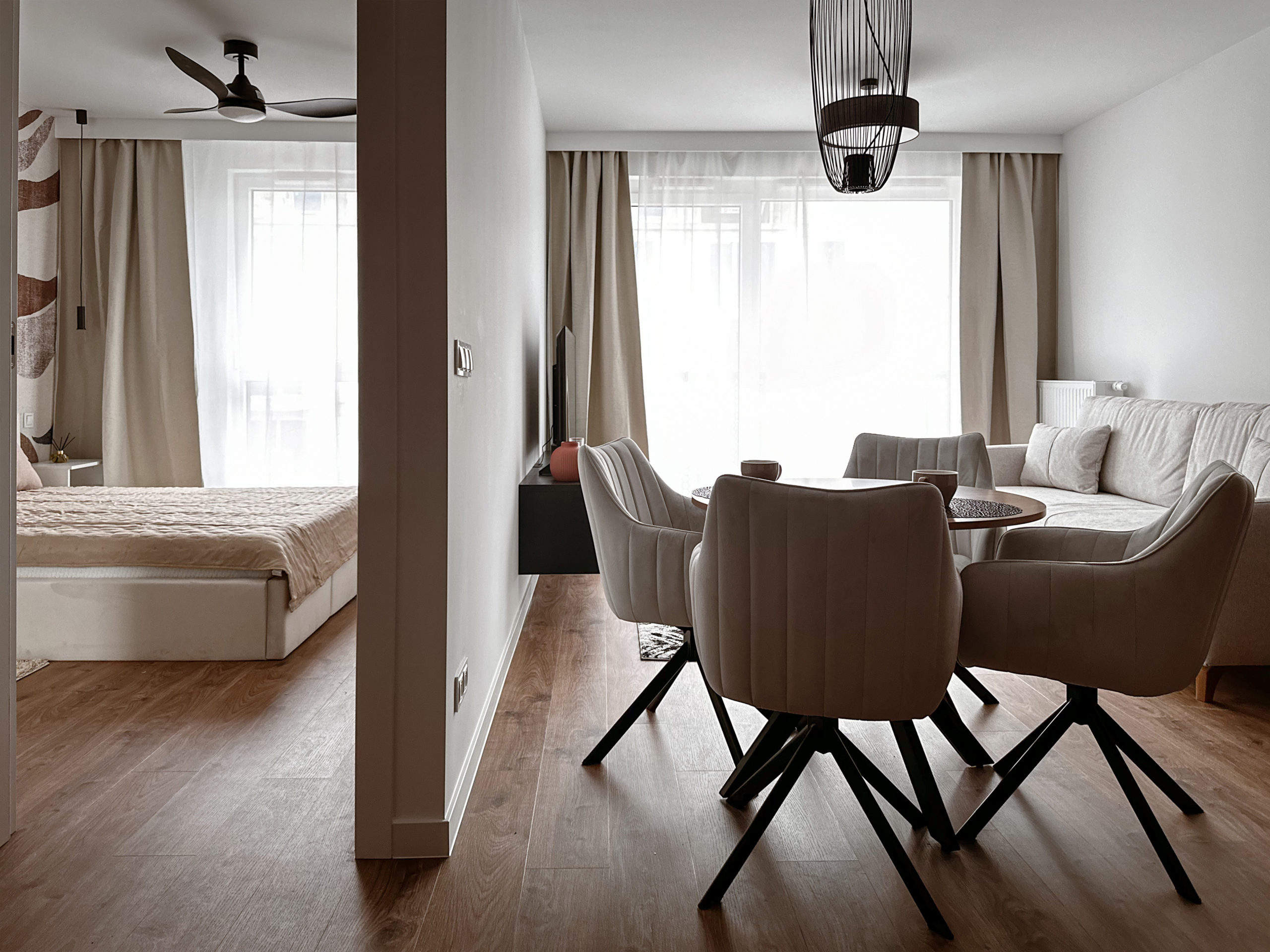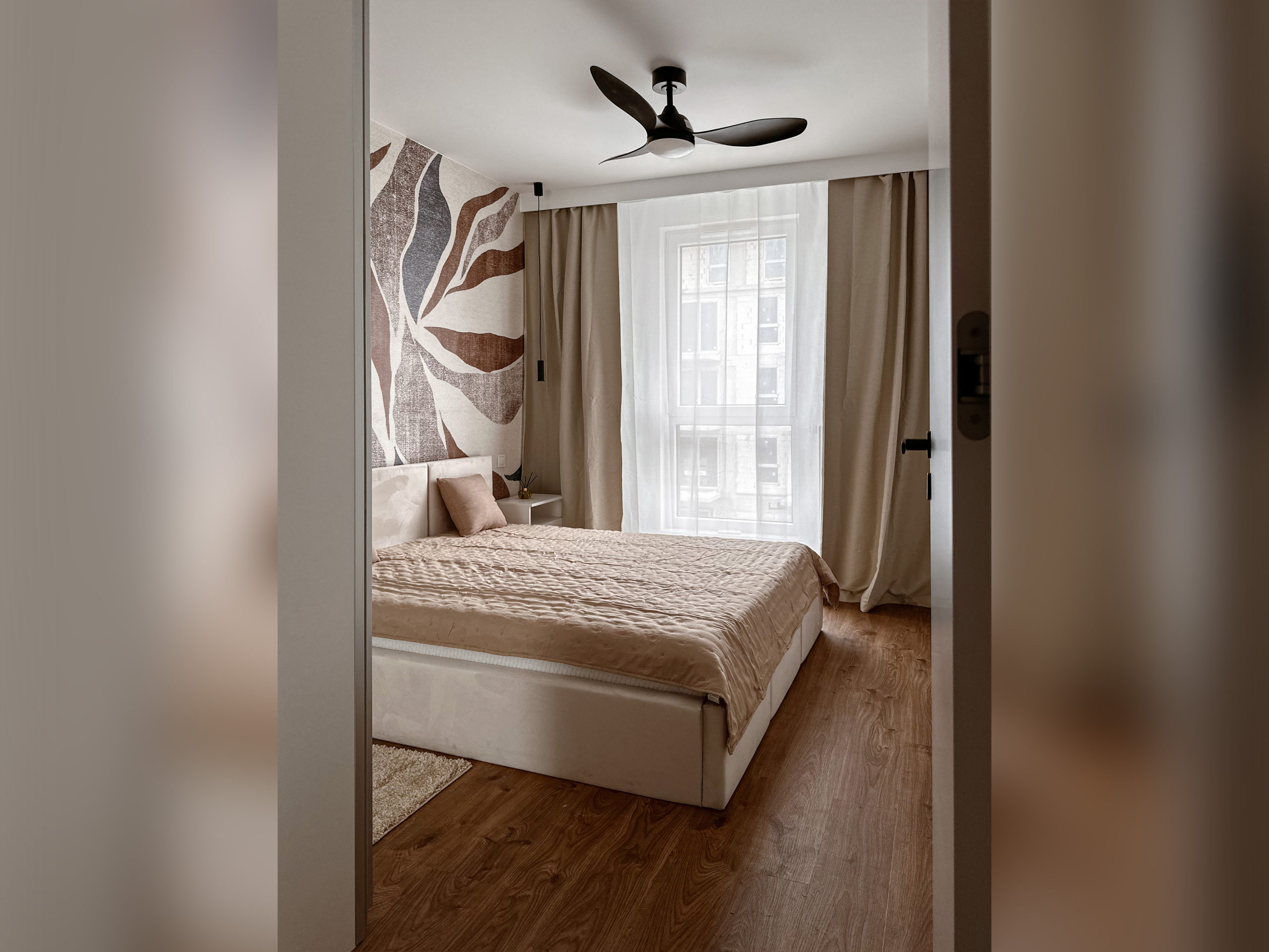 W sypialni wygodne łózko z pojemnikiem na pościel wentylator zapewniający chłód w upalne dni (z opcją zmiany barwy światła) oraz przestronna szafa.