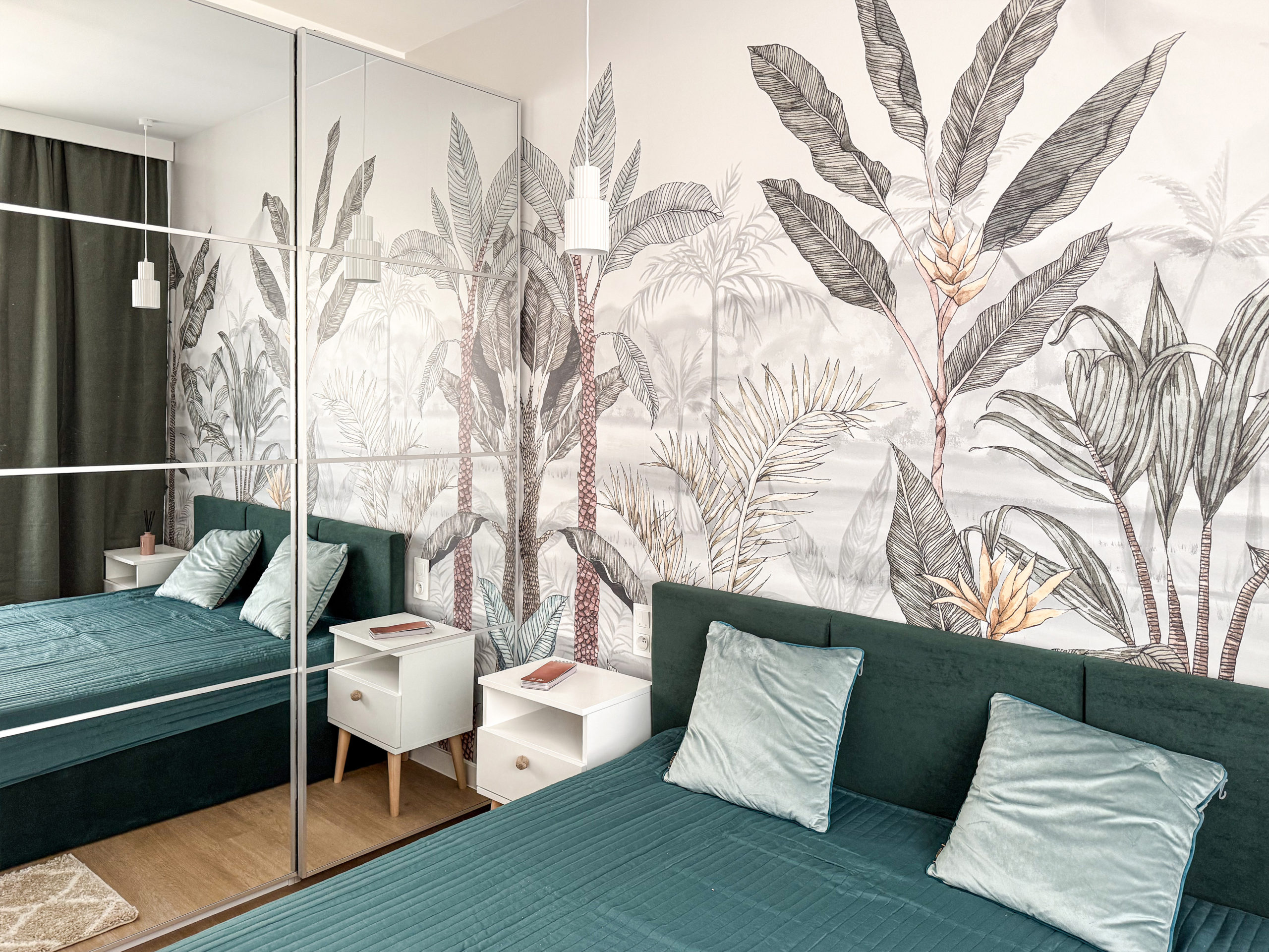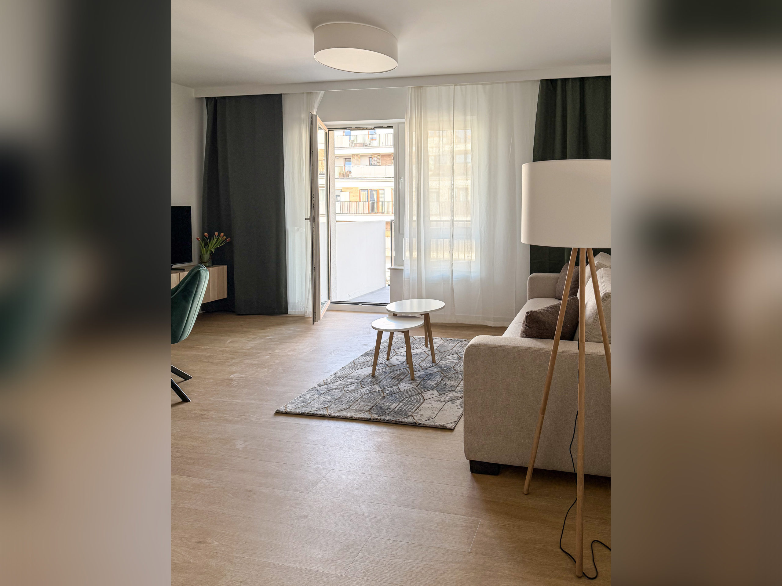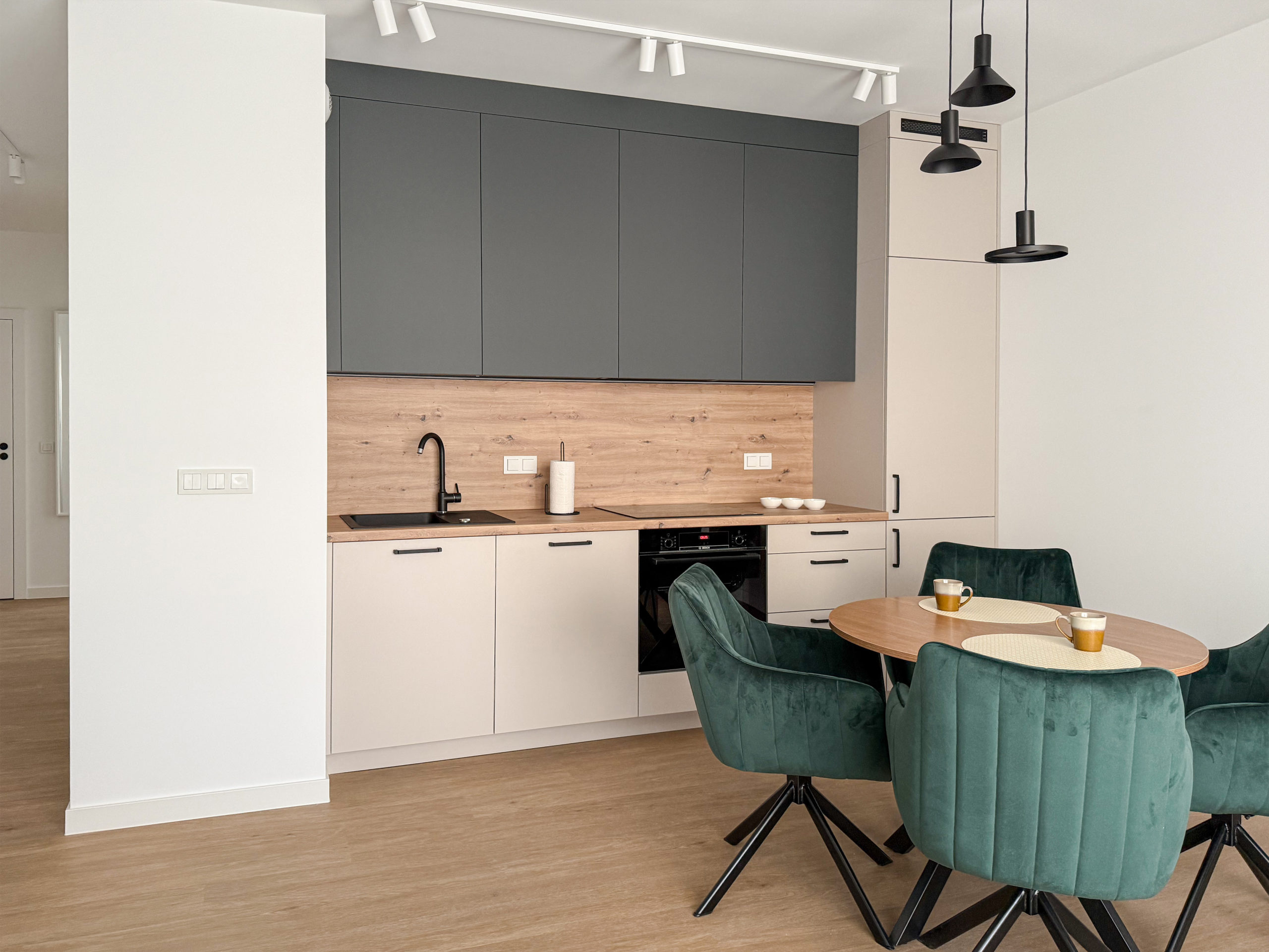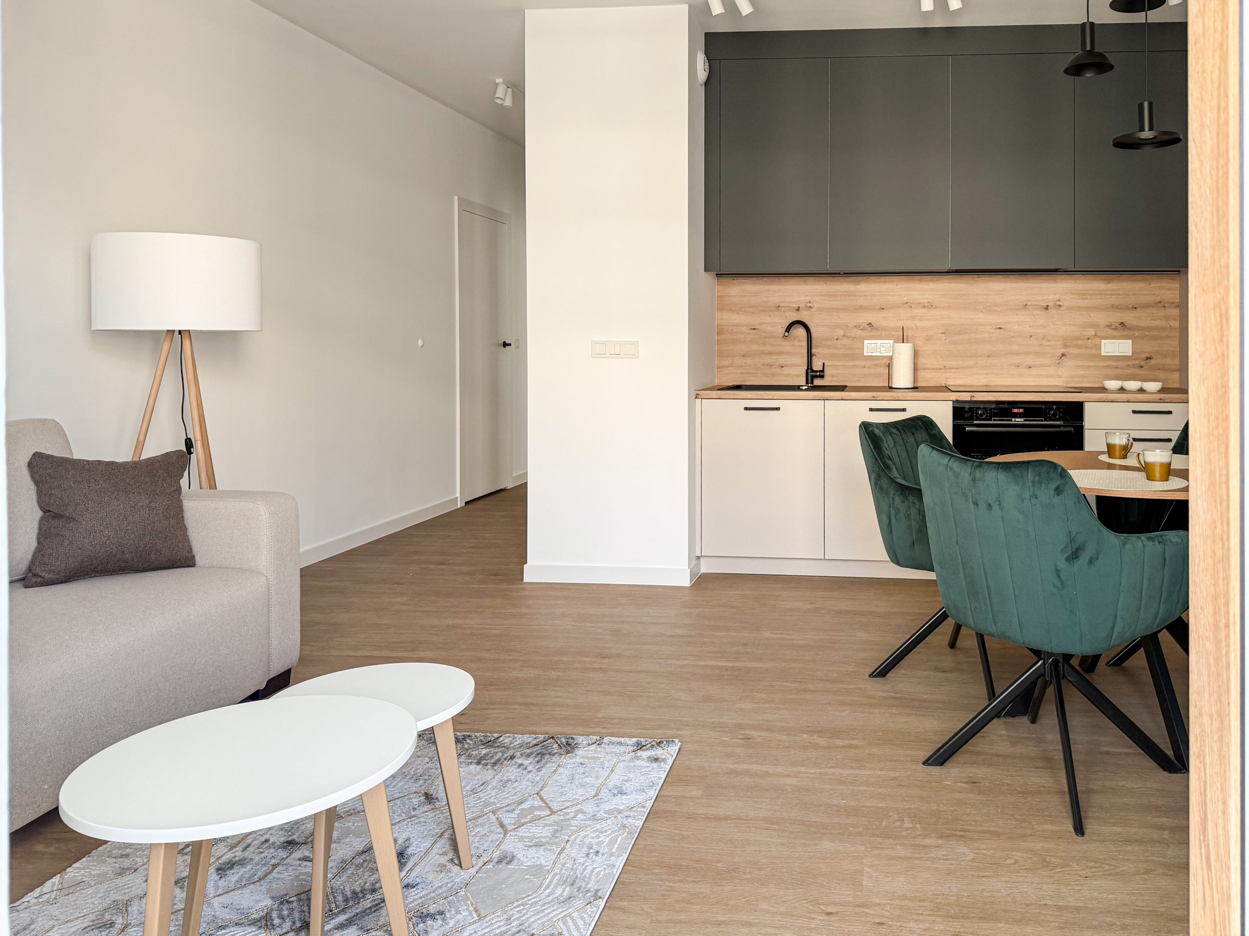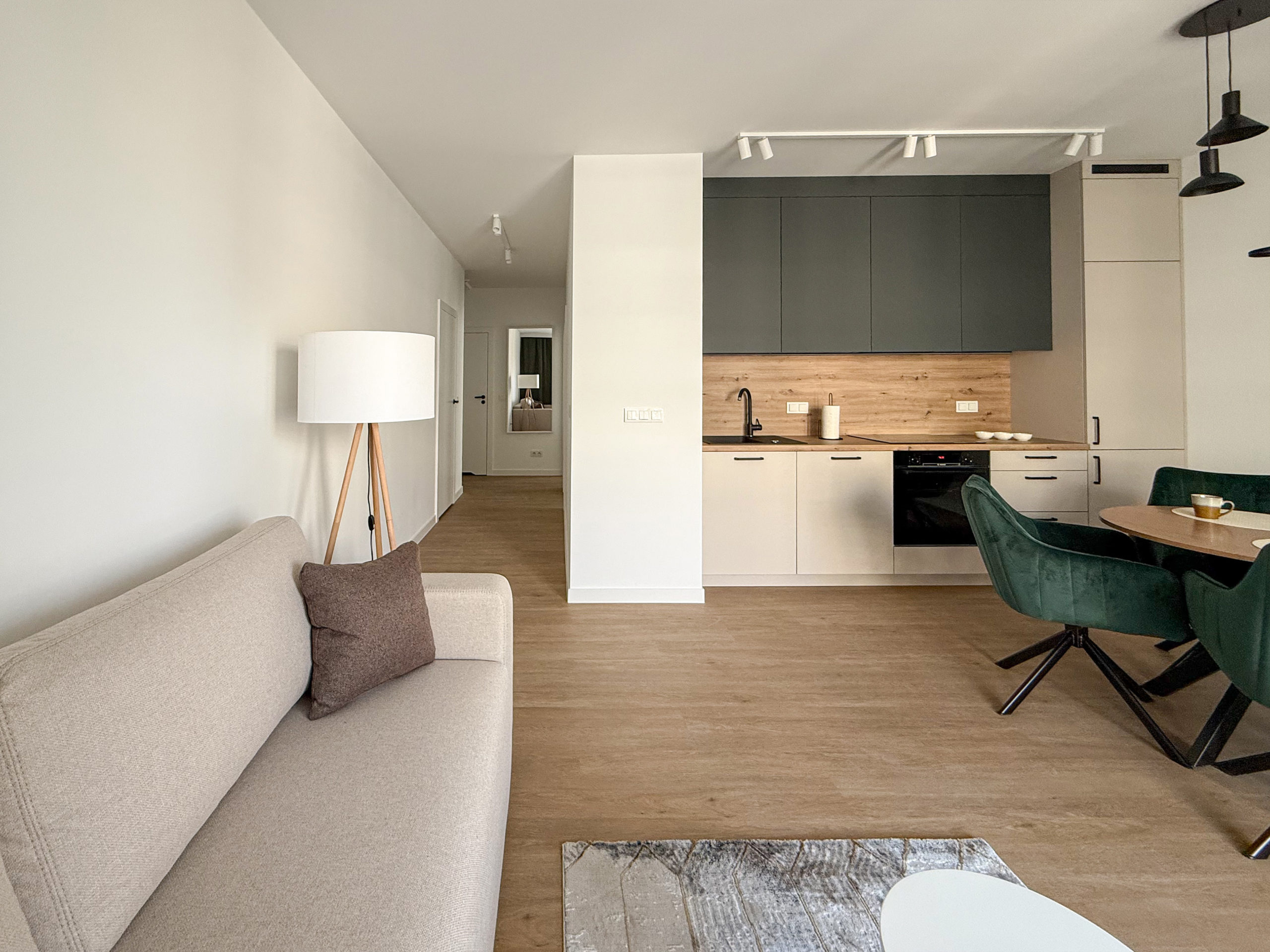 Do mieszkania przynależy miejsce postojowe w garażu podziemnym oraz komórka lokatorska. W mieszkaniu znajdują się dwie sypialnie, salon z aneksem kuchennym, łazienka oraz oddzielna garderoba. W sypialni głównej znajduje się łóżko o wymiarach 160×200 cm (z pojemnikiem na pościel), szafa oraz wentylator z oświetleniem. W drugiej sypialni znajduje się sofa oraz szafa. Przestronna kuchnia została wyposażona w meble wykonane na zamówienie oraz w wysokiej jakości sprzęt AGD marki Bosch. W lokalu jest bardzo dużo miejsca do przechowywania dzięki robionej na zamówienie oddzielnej garderobie. Mieszkanie usytuowane jest w bardzo dobrym punkcie komunikacyjnym z bliskim dostępem do punktów handlowo-usługowych (w sąsiedztwie Centrum Handlowe Promenada, Centrum Handlowe Gocław). W niedalekiej odległości znajduje się Jeziorko Balaton z licznymi alejkami spacerowymi oraz kawiarnią.