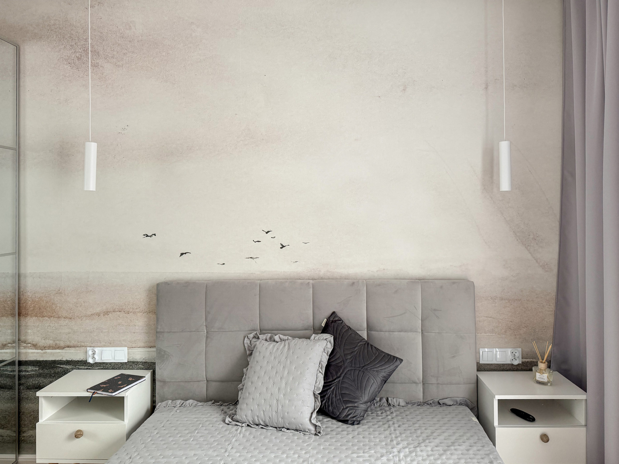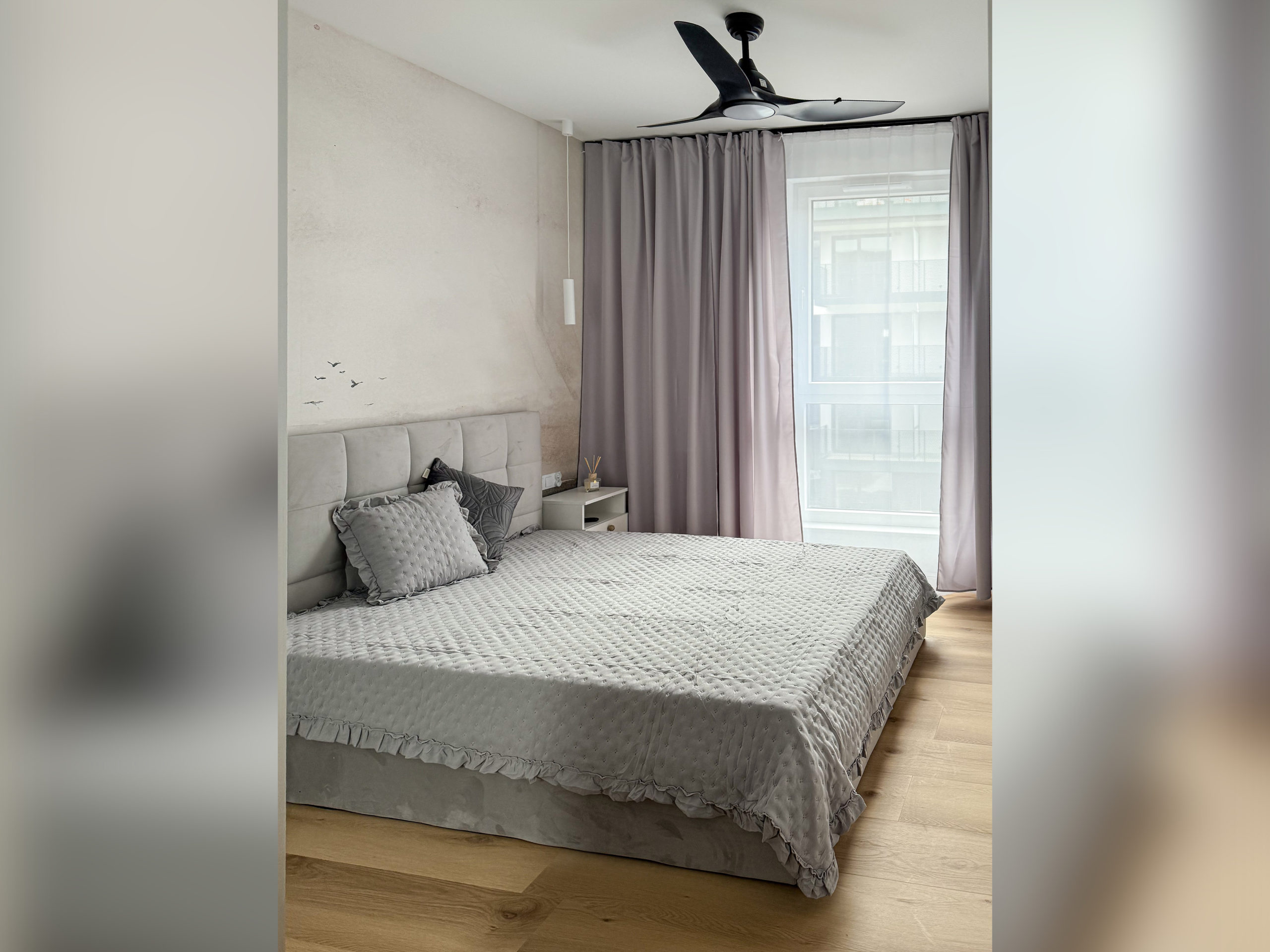 W sypialni wygodne łózko z pojemnikiem na pościel wentylator zapewniający chłód w upalne dni (z opcją zmiany barwy światła) oraz przestronna szafa.