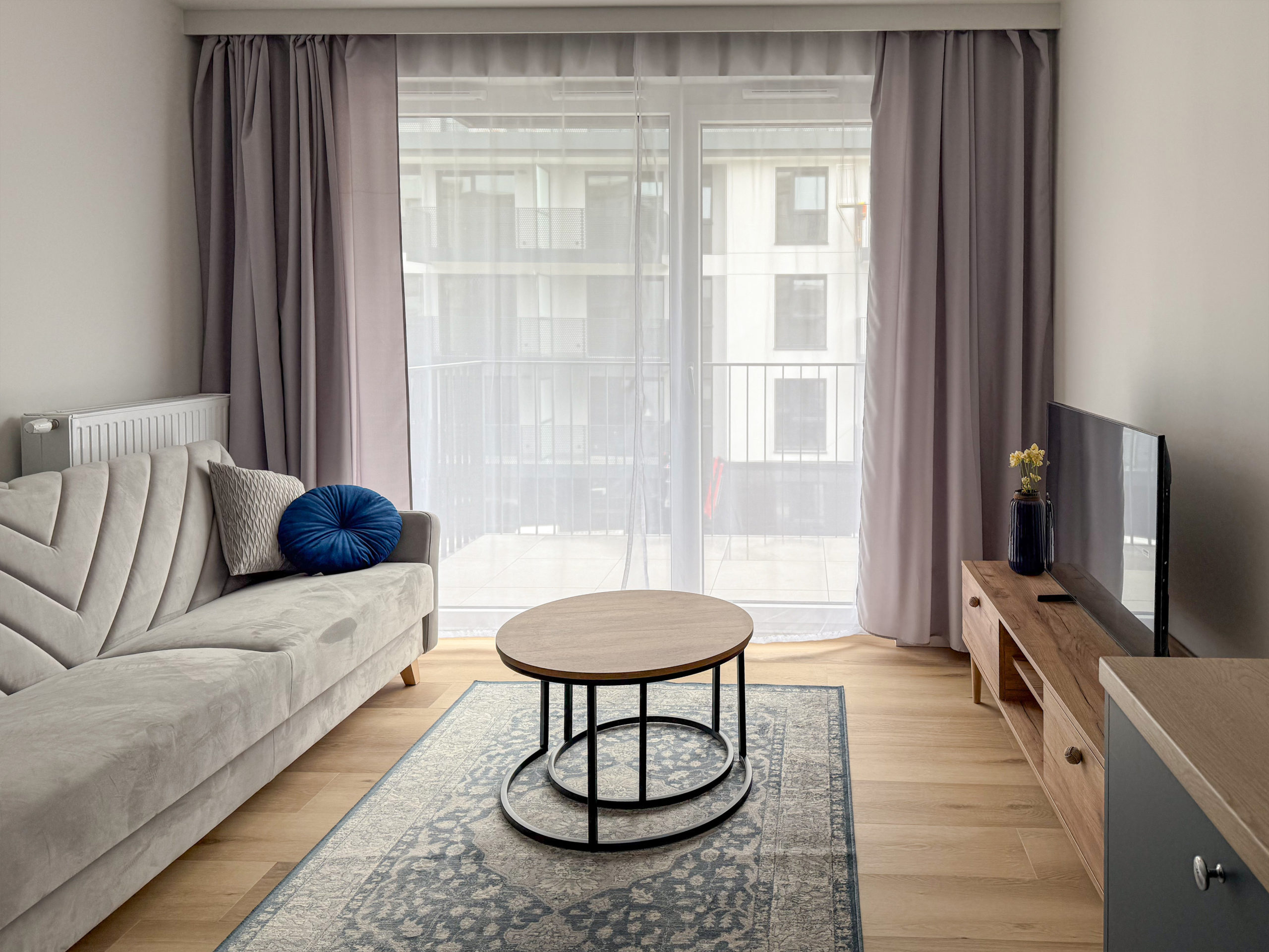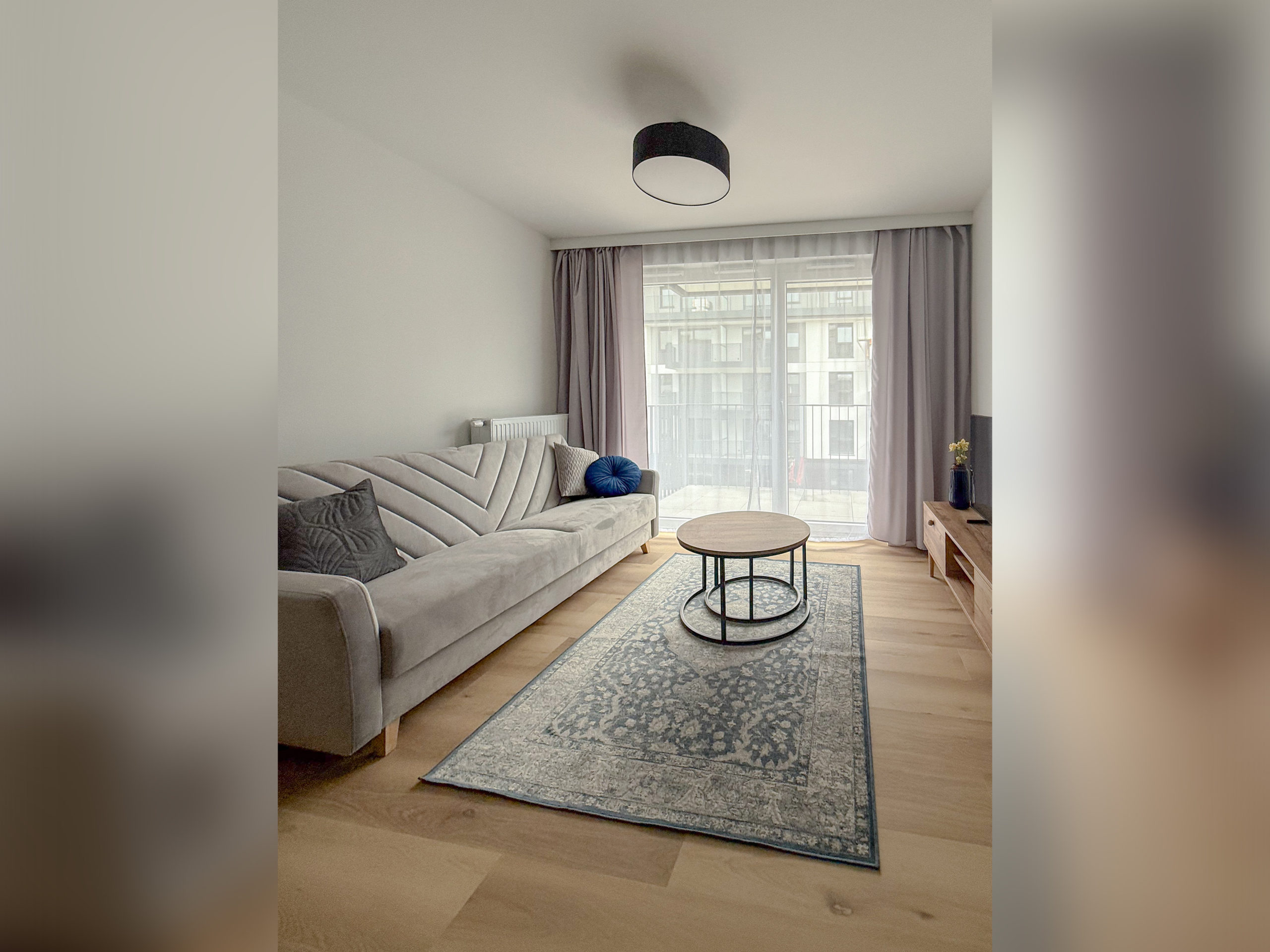 W salonie wygodna kanapa z funkcją spania i pojemnikiem na pościel.