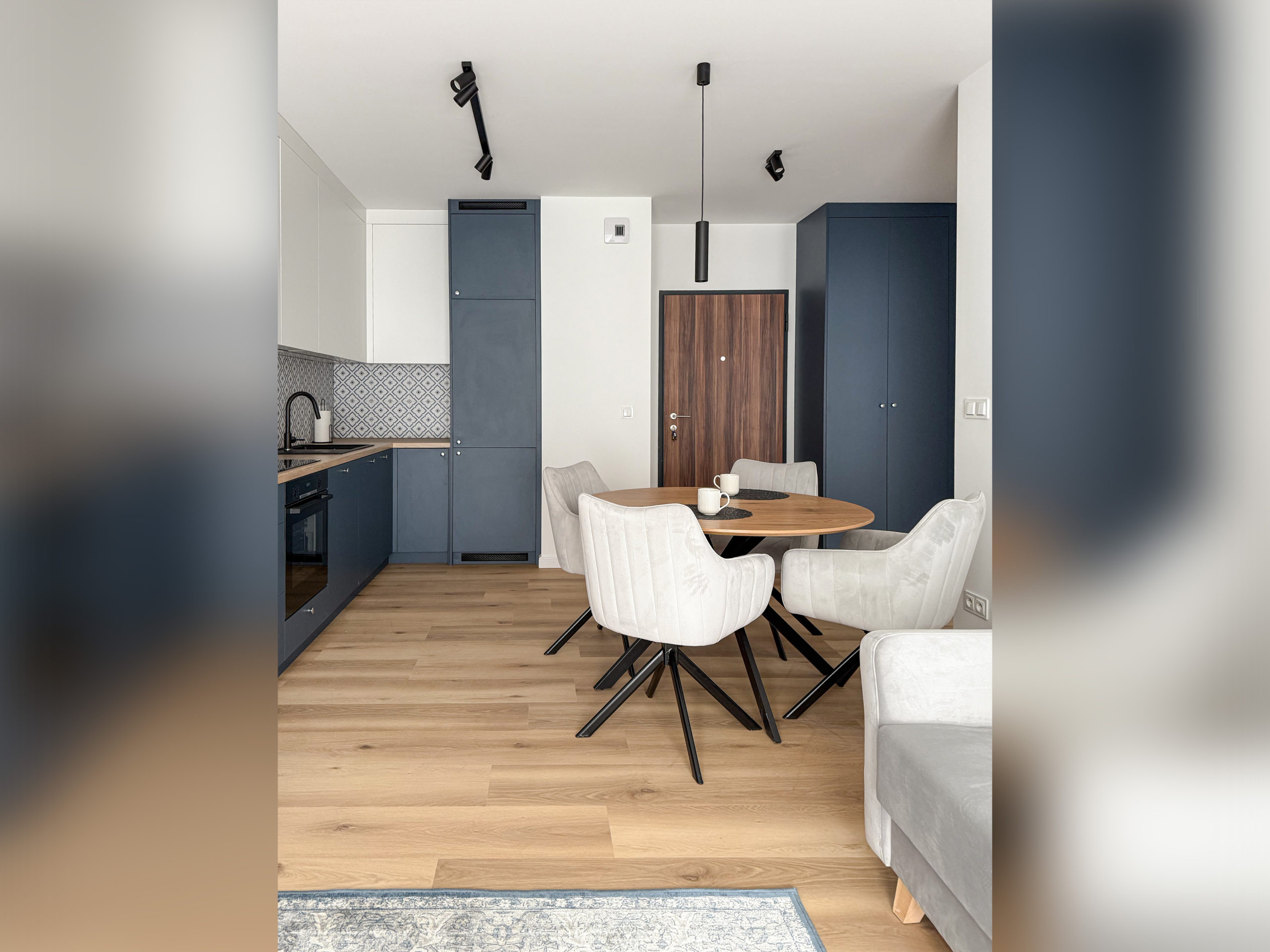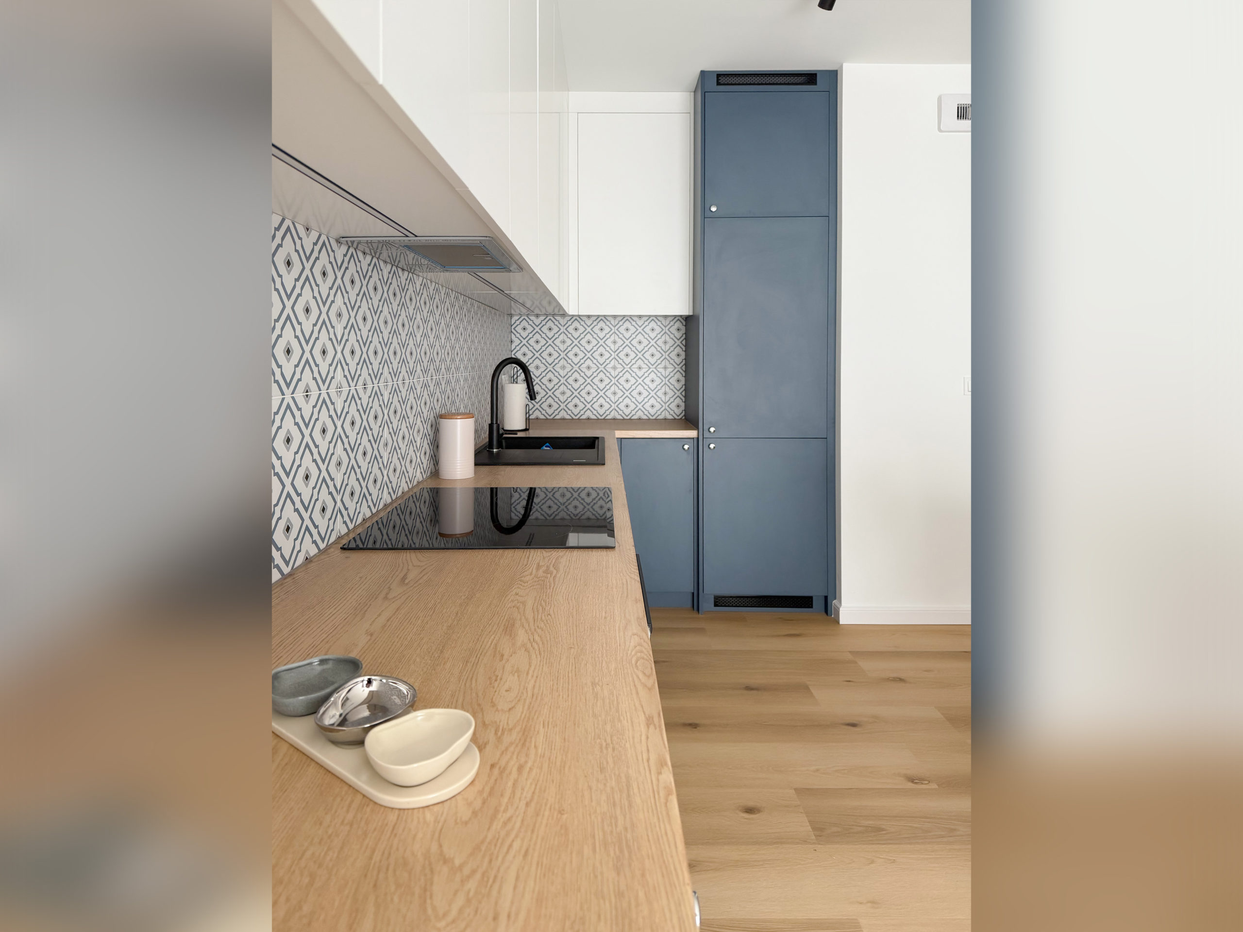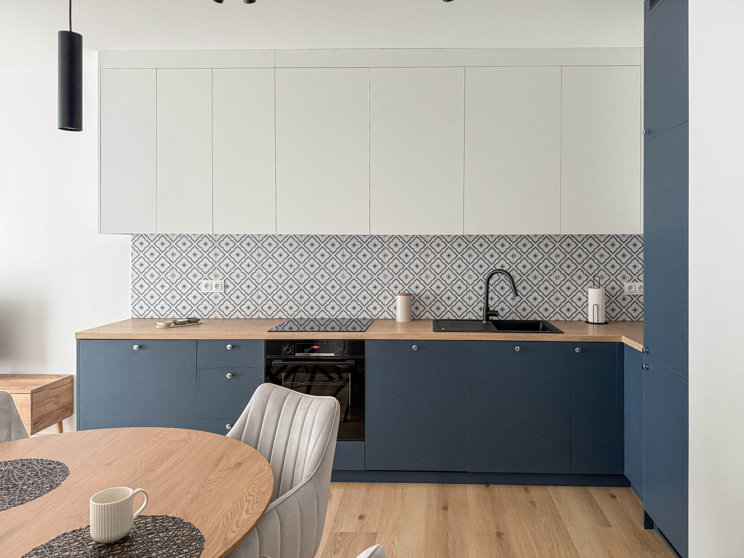 Gustownie urządzone z wykorzystaniem wysokiej jakości materiałów, zabudowa AGD Bosch, LG, zlew Franke.