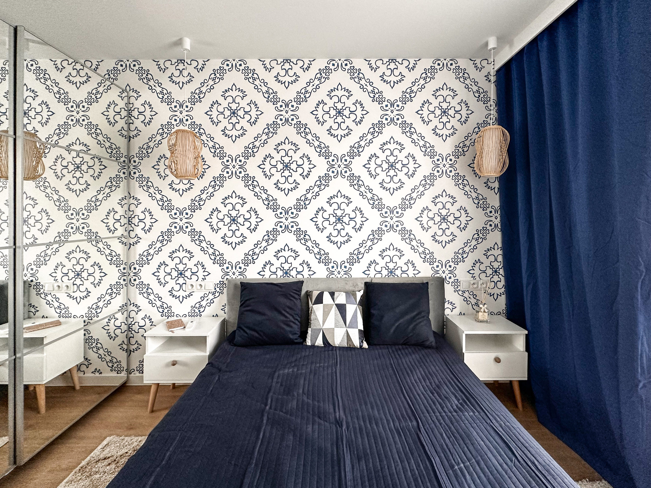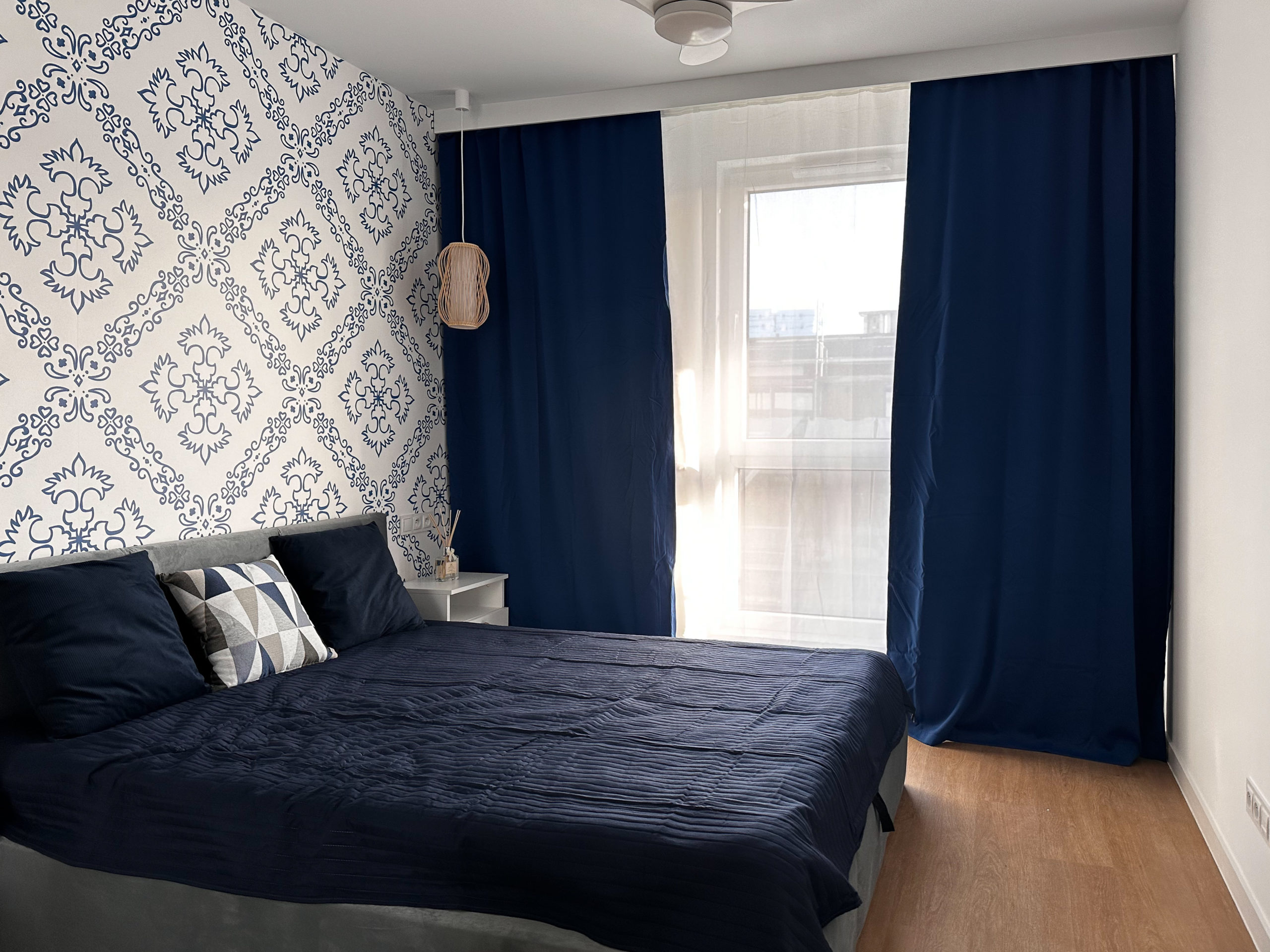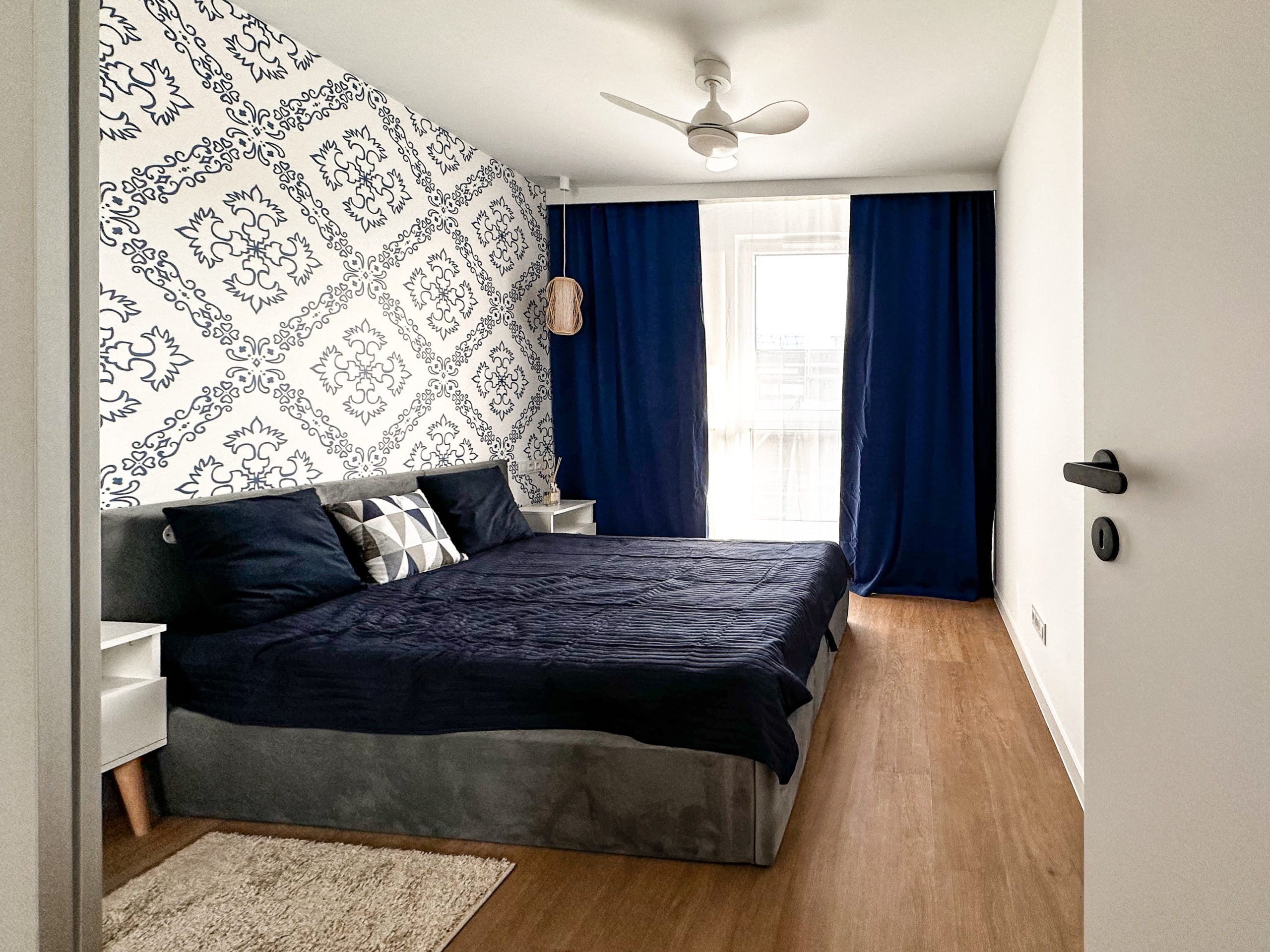 W sypialni wygodne łózko z pojemnikiem na pościel wentylator zapewniający chłód w upalne dni (z opcją zmiany barwy światła) oraz przestronna szafa.