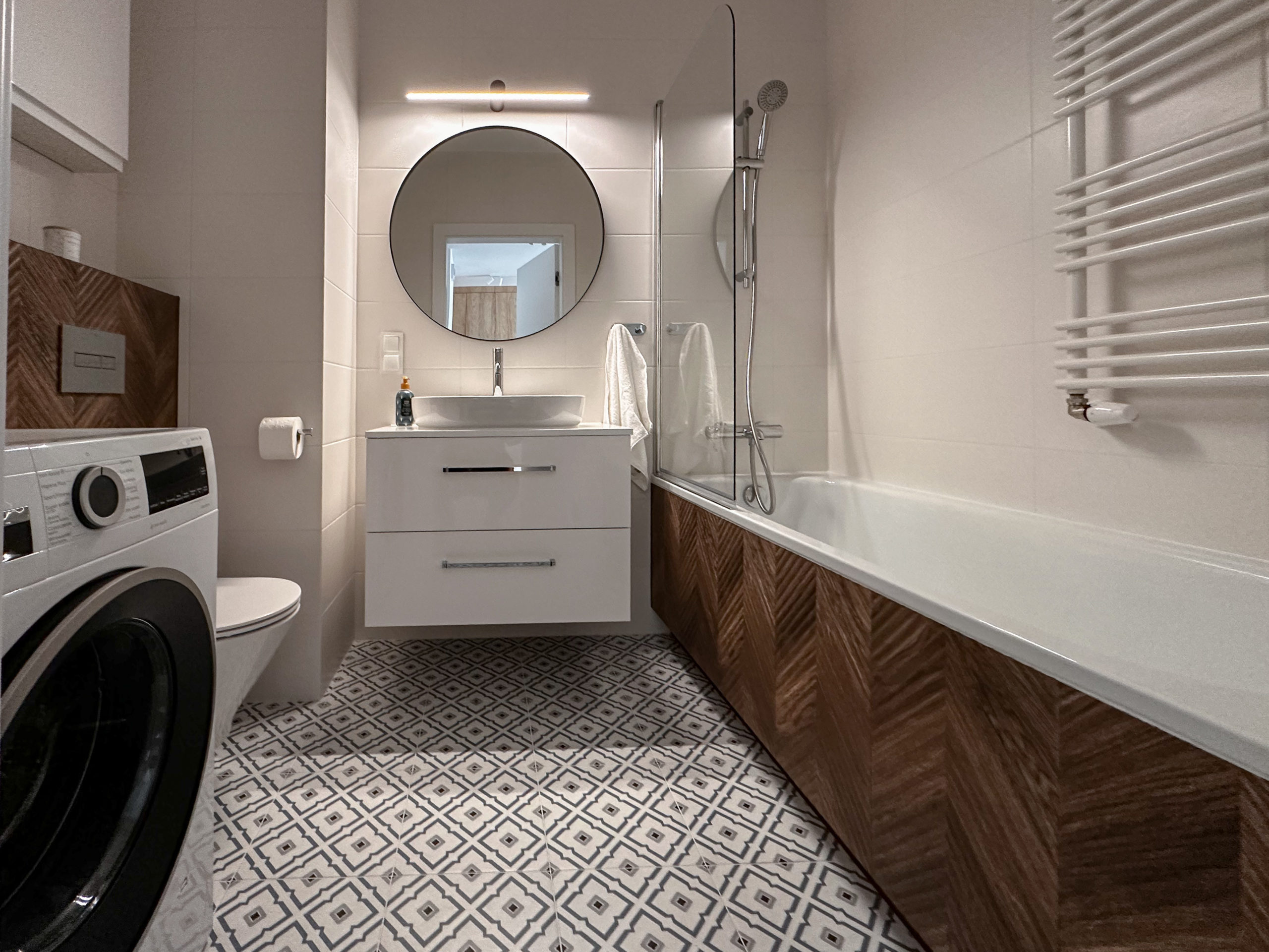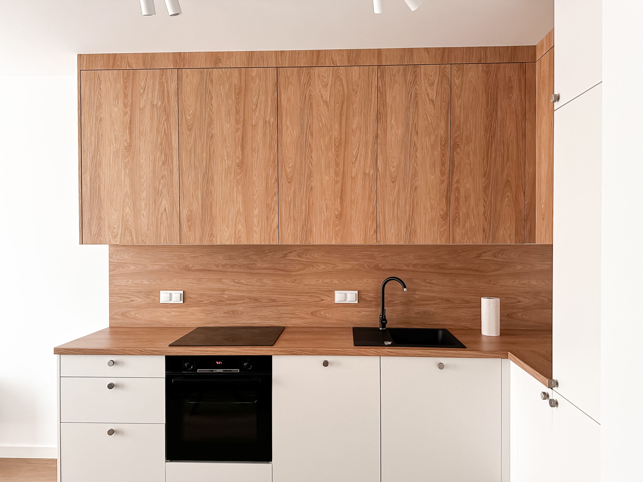 Gustownie urządzone z wykorzystaniem wysokiej jakości materiałów, zabudowa AGD Bosch, zlew Franke,
