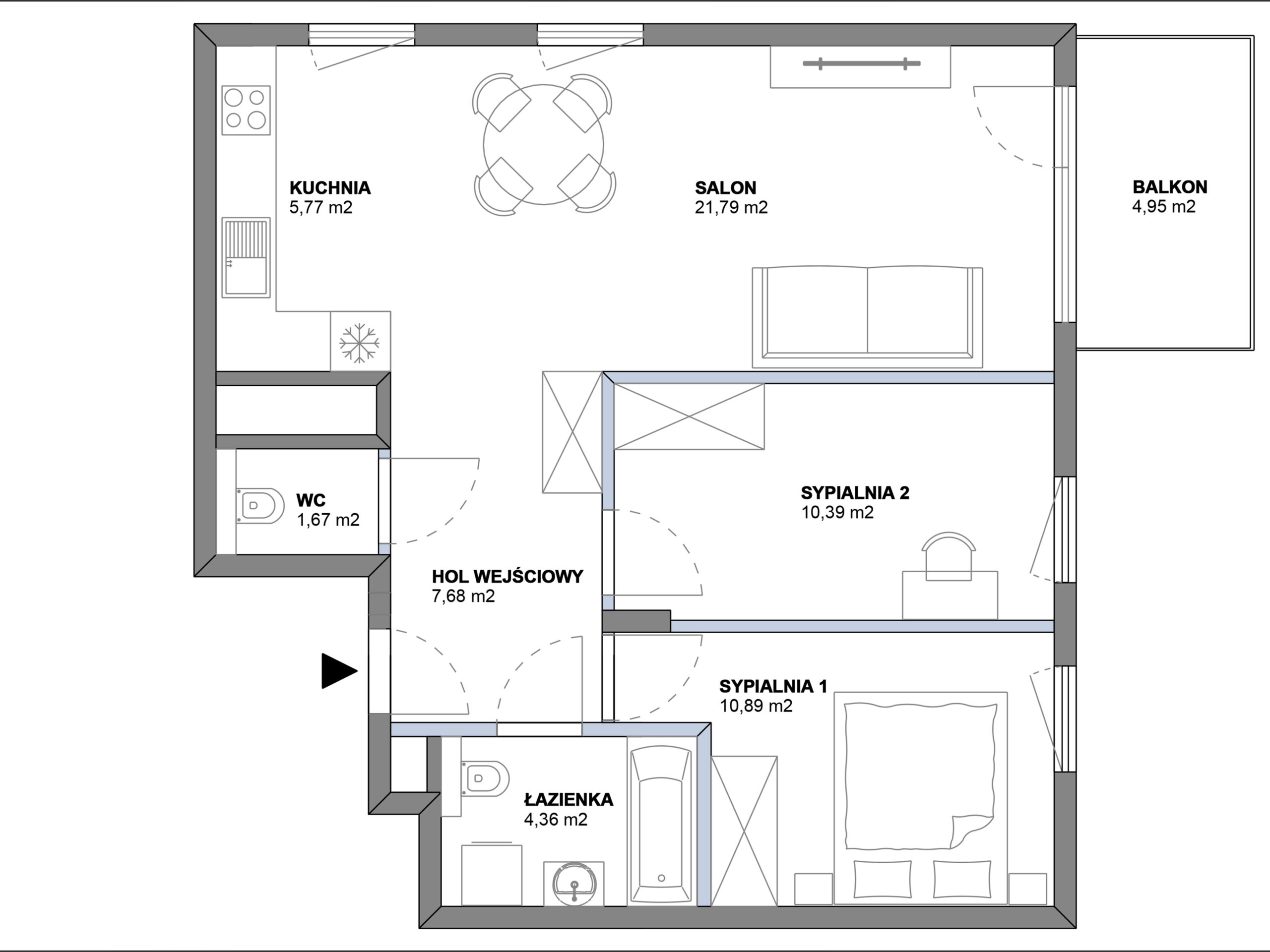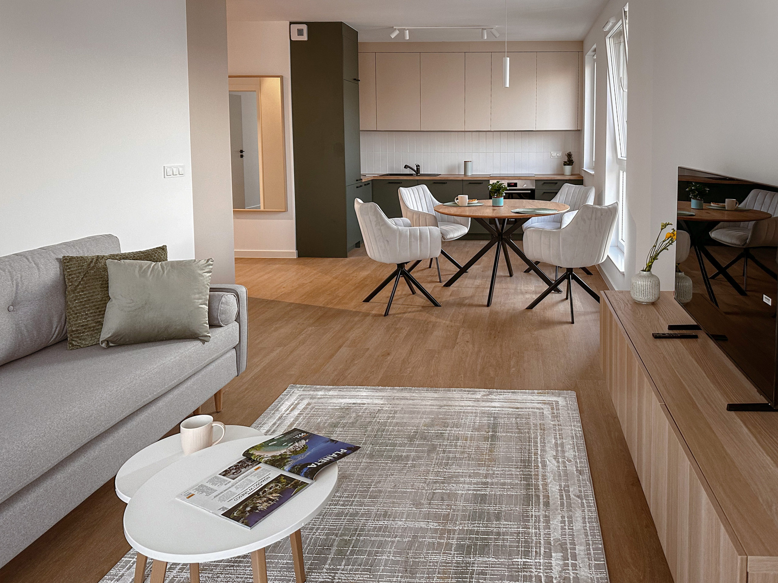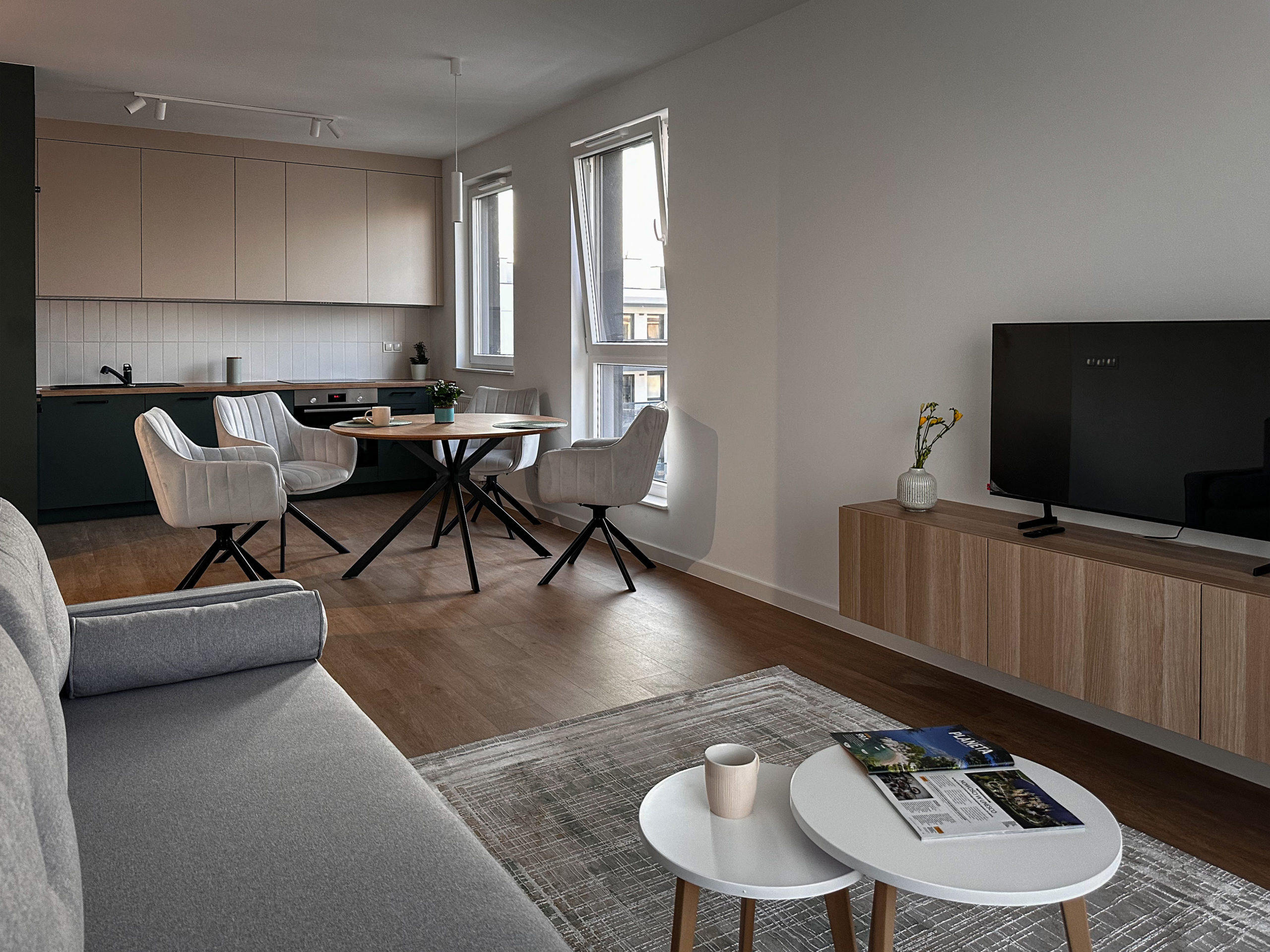 Mieszkanie składa się z salonu z aneksem kuchennym, sypialni, pokoju i 2 łazienek.