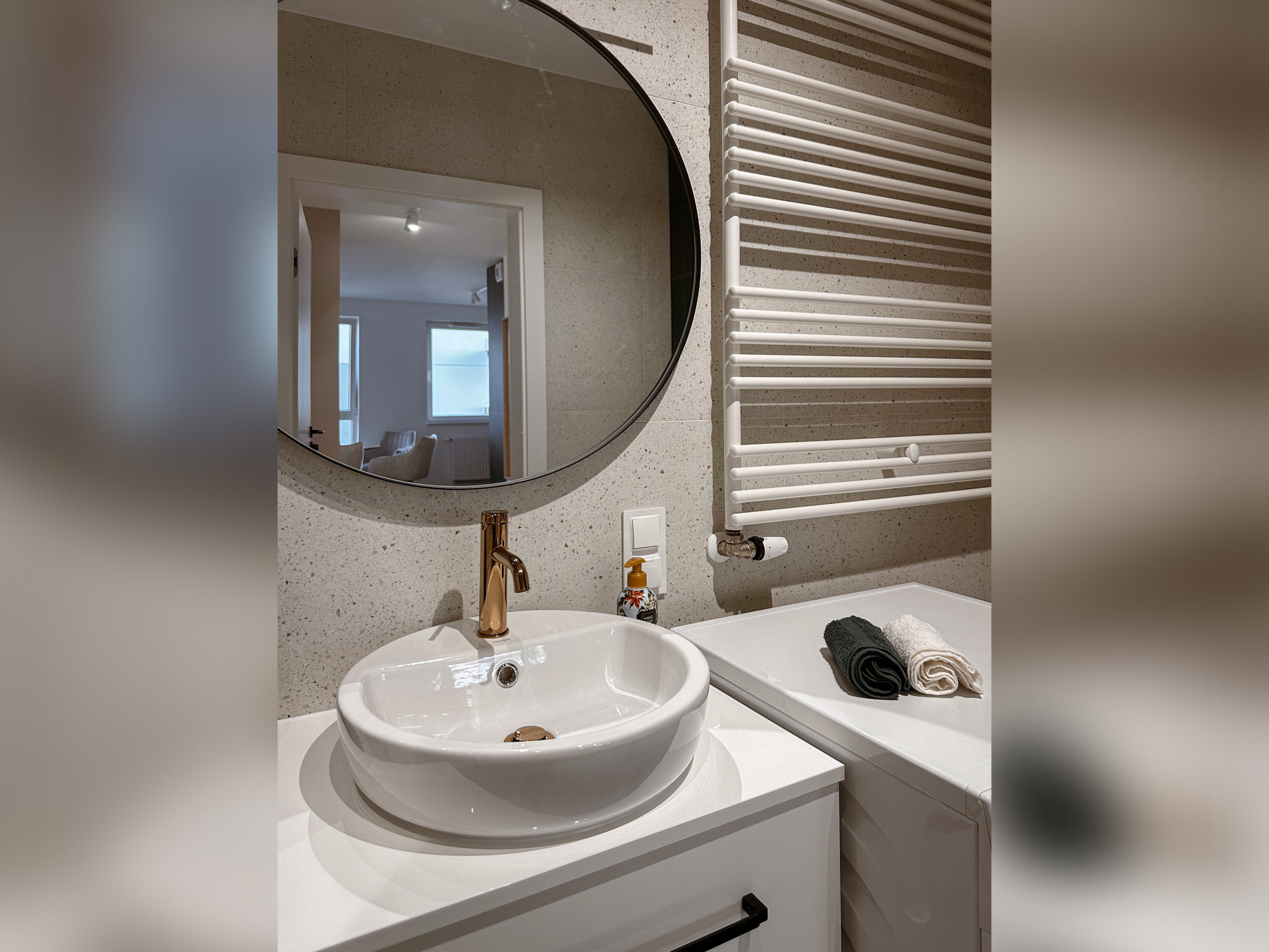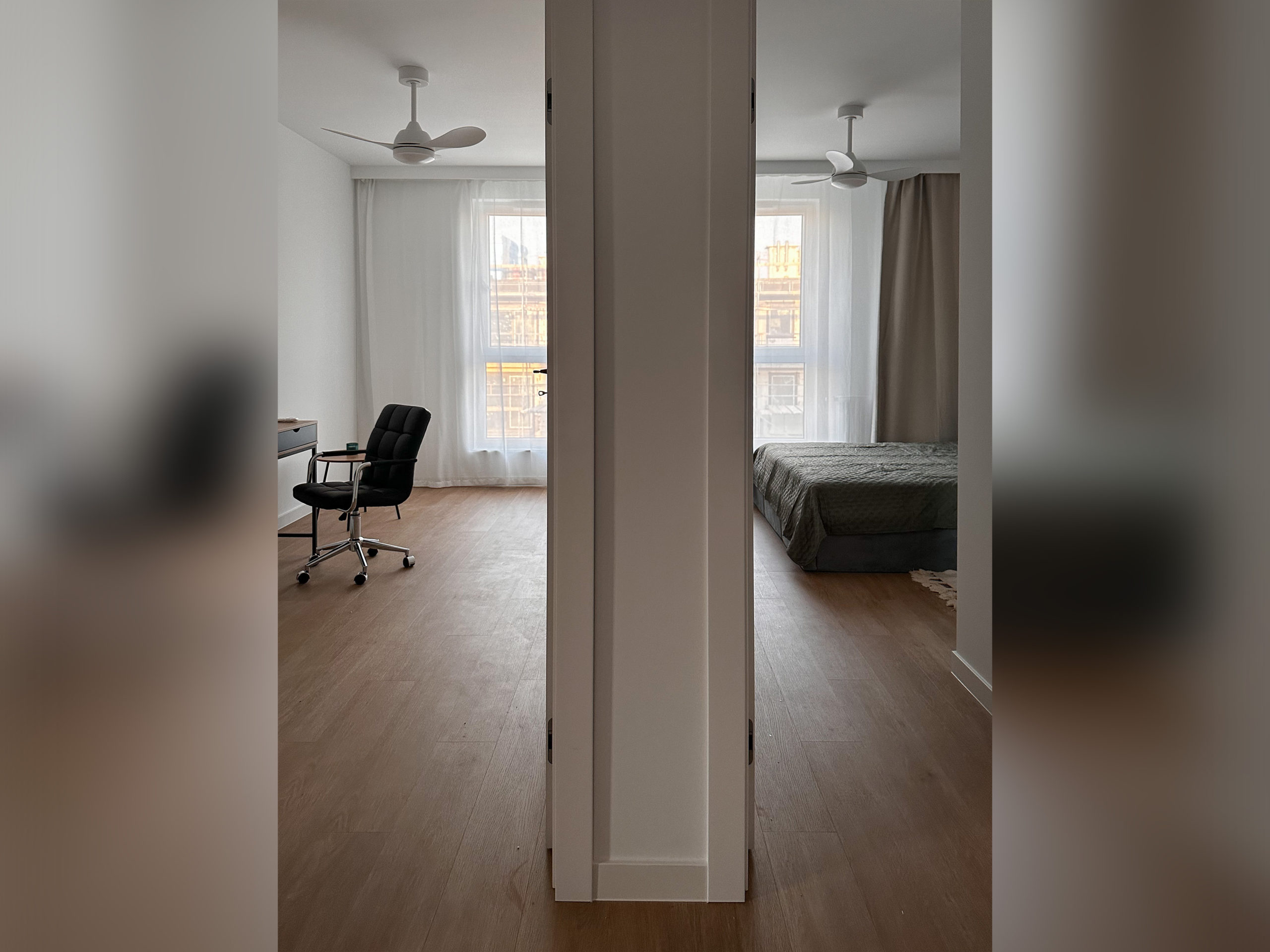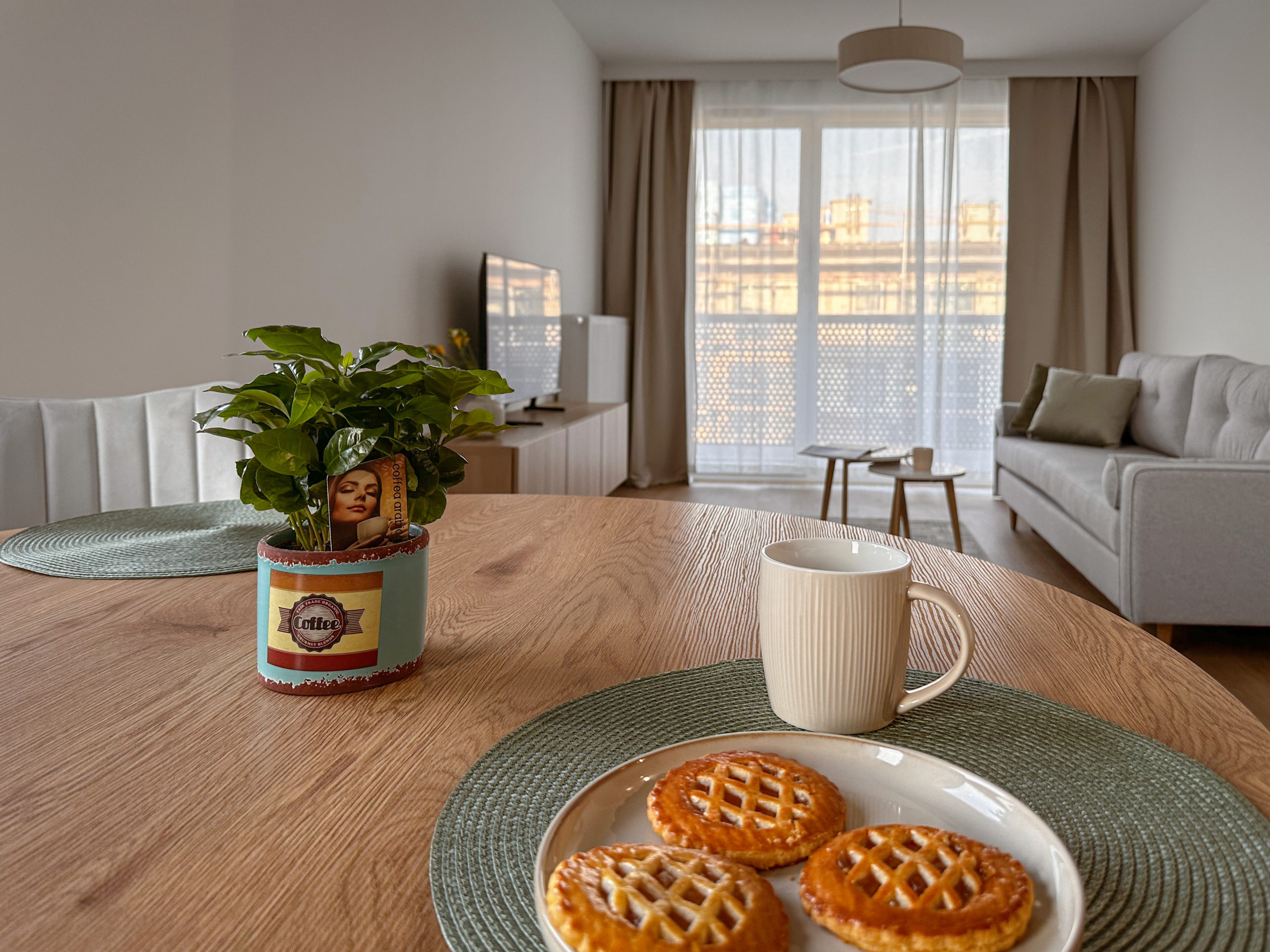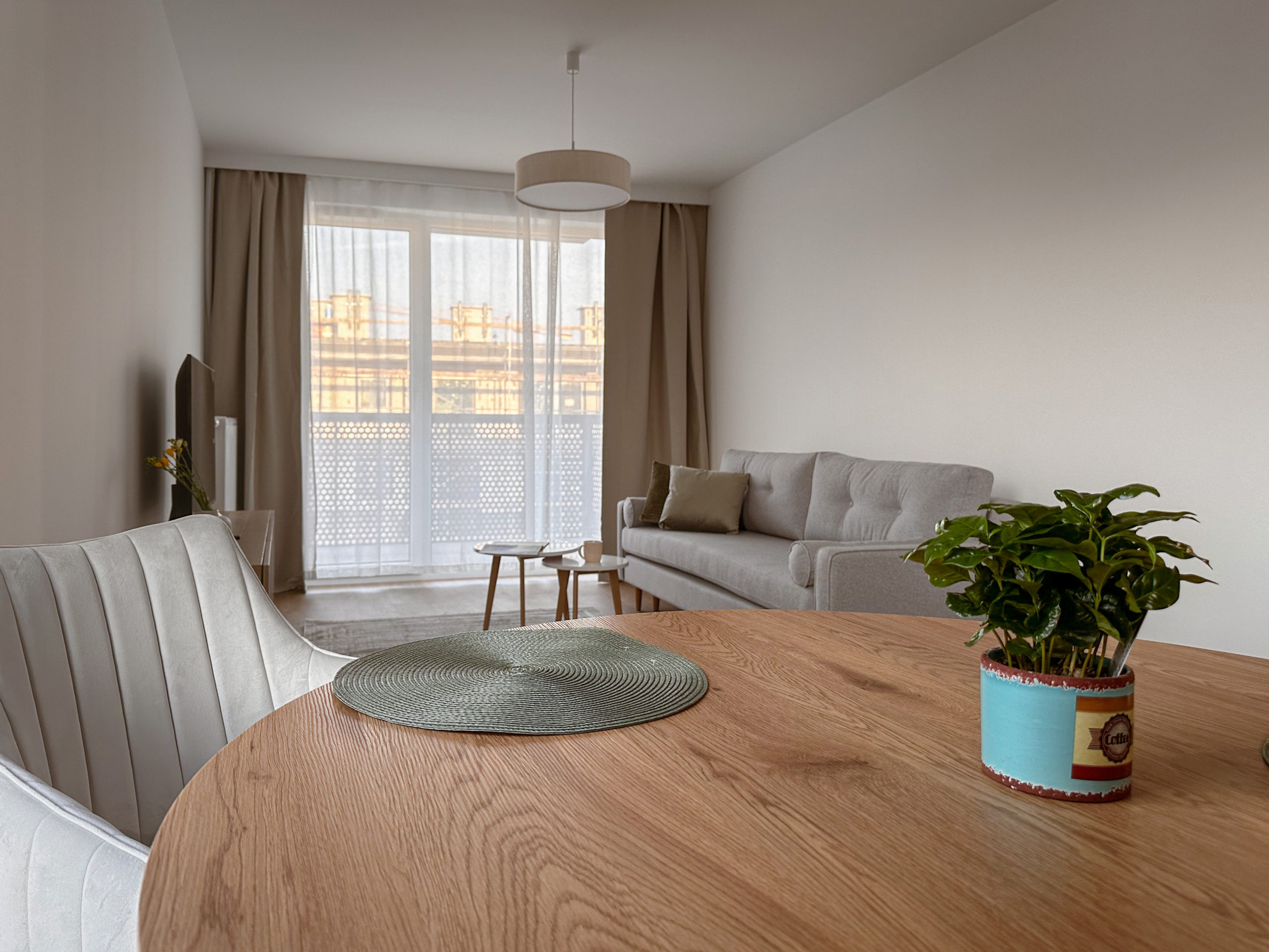 Mieszkanie składa się z salonu z aneksem kuchennym, sypialni, pokoju i 2 łazienek.