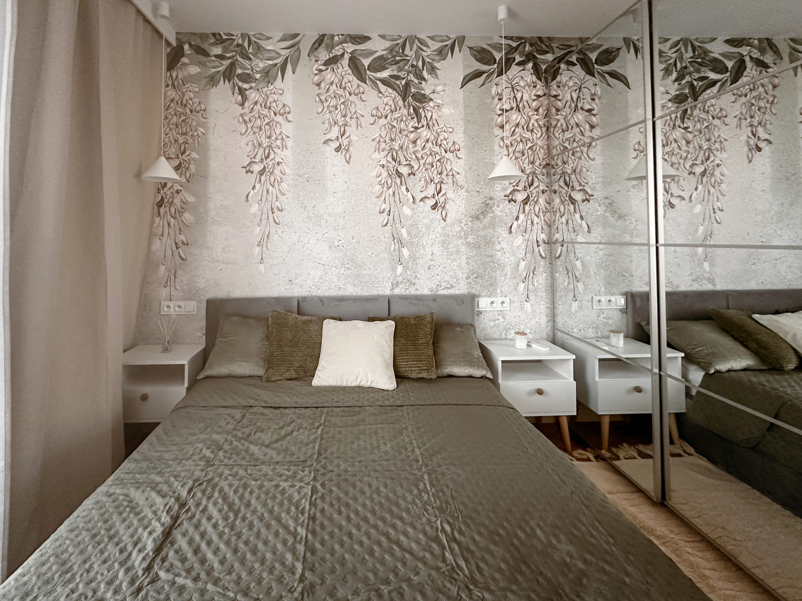 W sypialni wygodne łóżko z pojemnikiem na pościel, wentylator zapewniający chłód w upalne dni (z opcją zmiany barwy światła) oraz przestronna szafa.