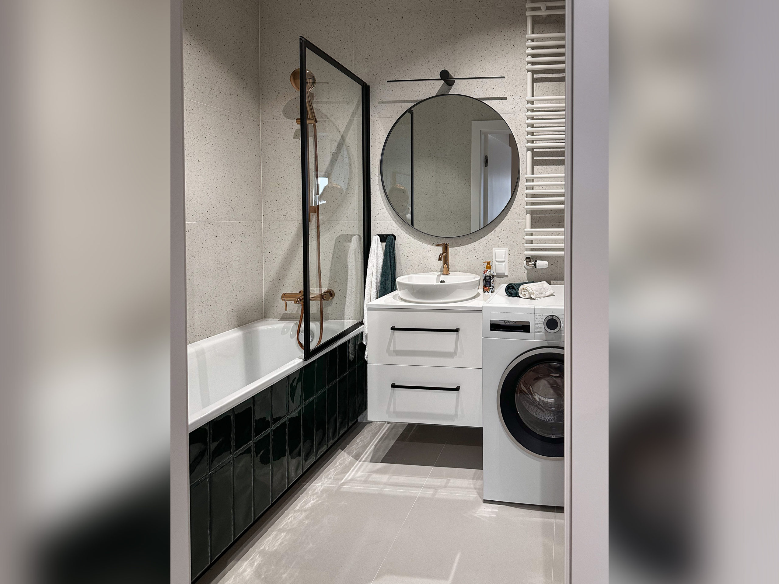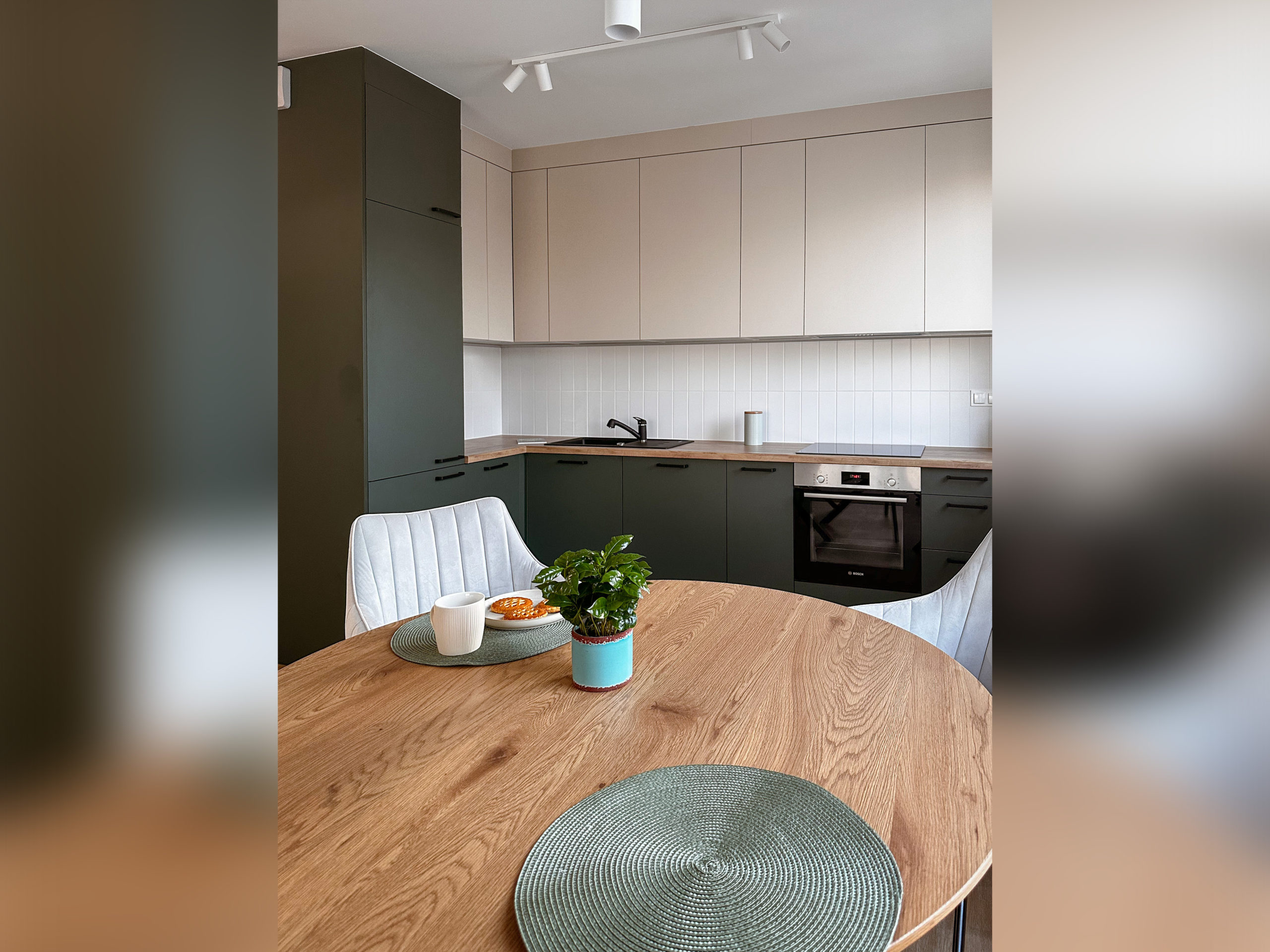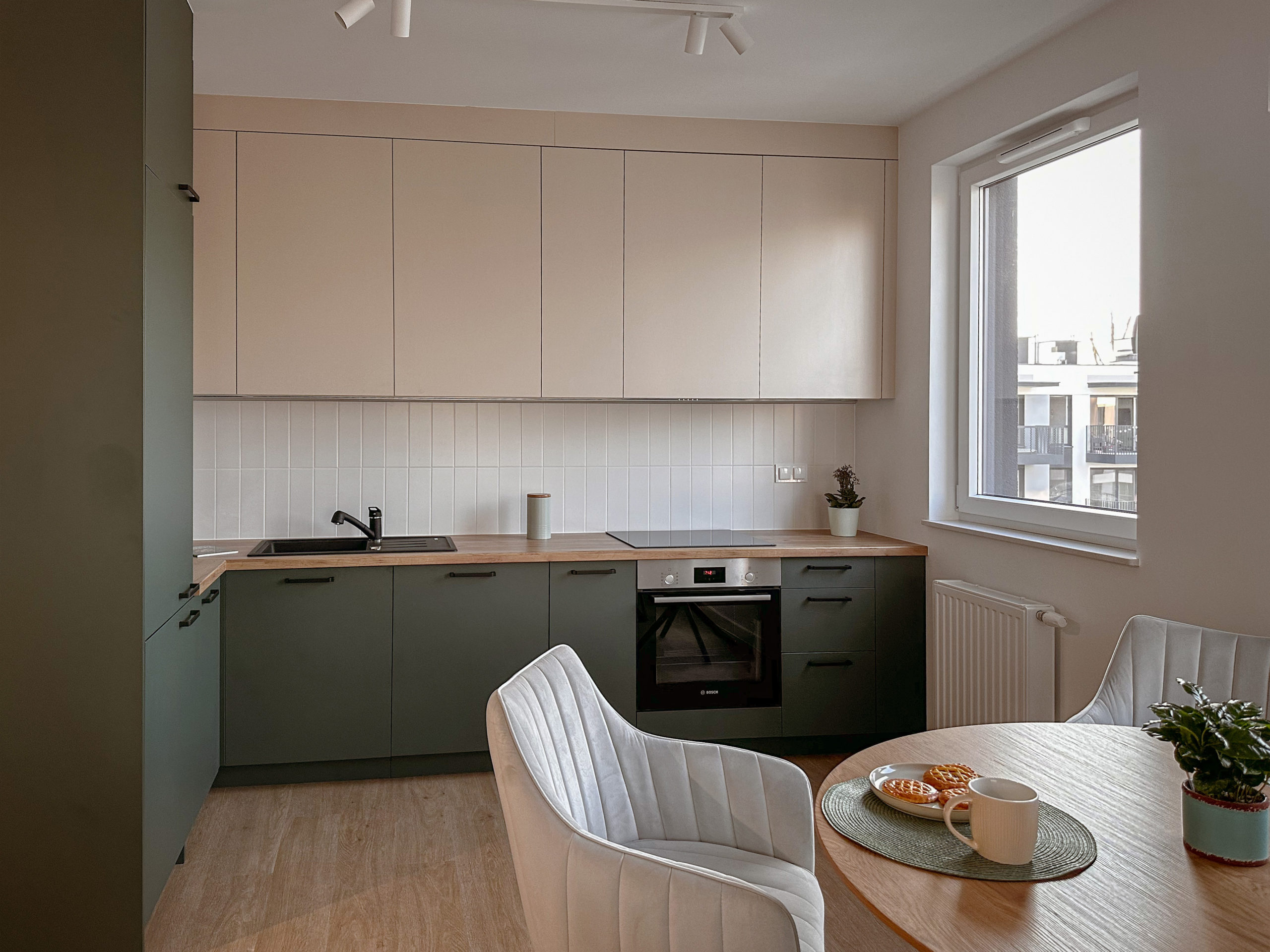 Gustownie urządzone z wykorzystaniem wysokiej jakości materiałów, zabudowa AGD Bosch, zlew Franke.