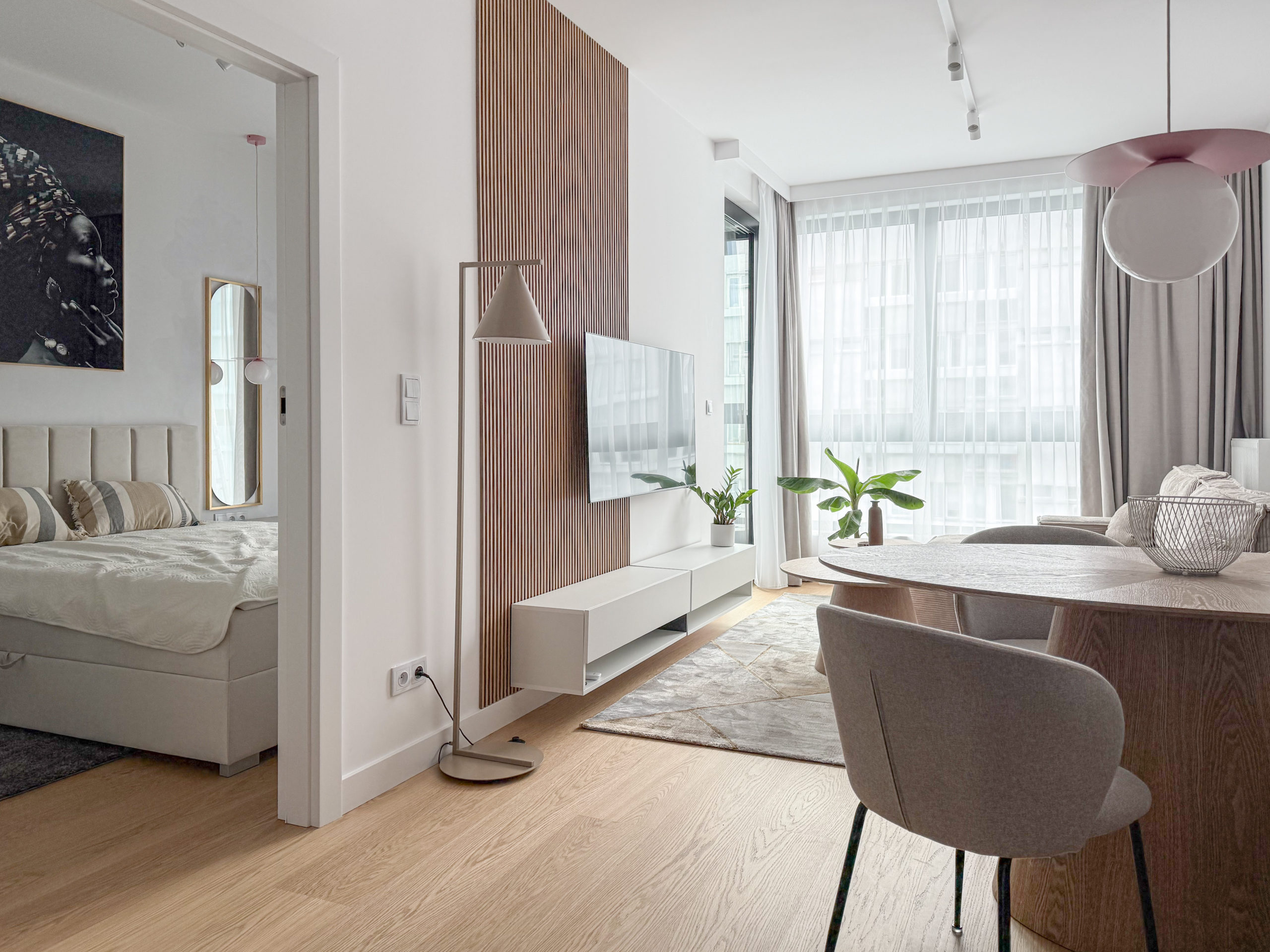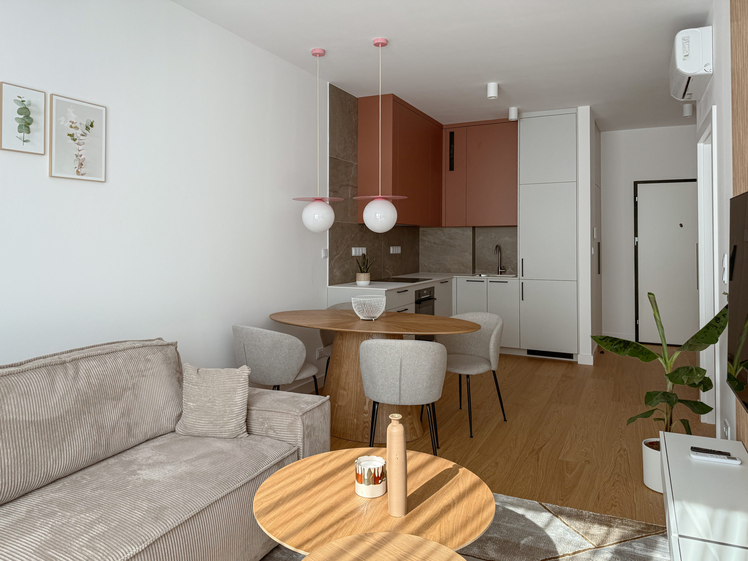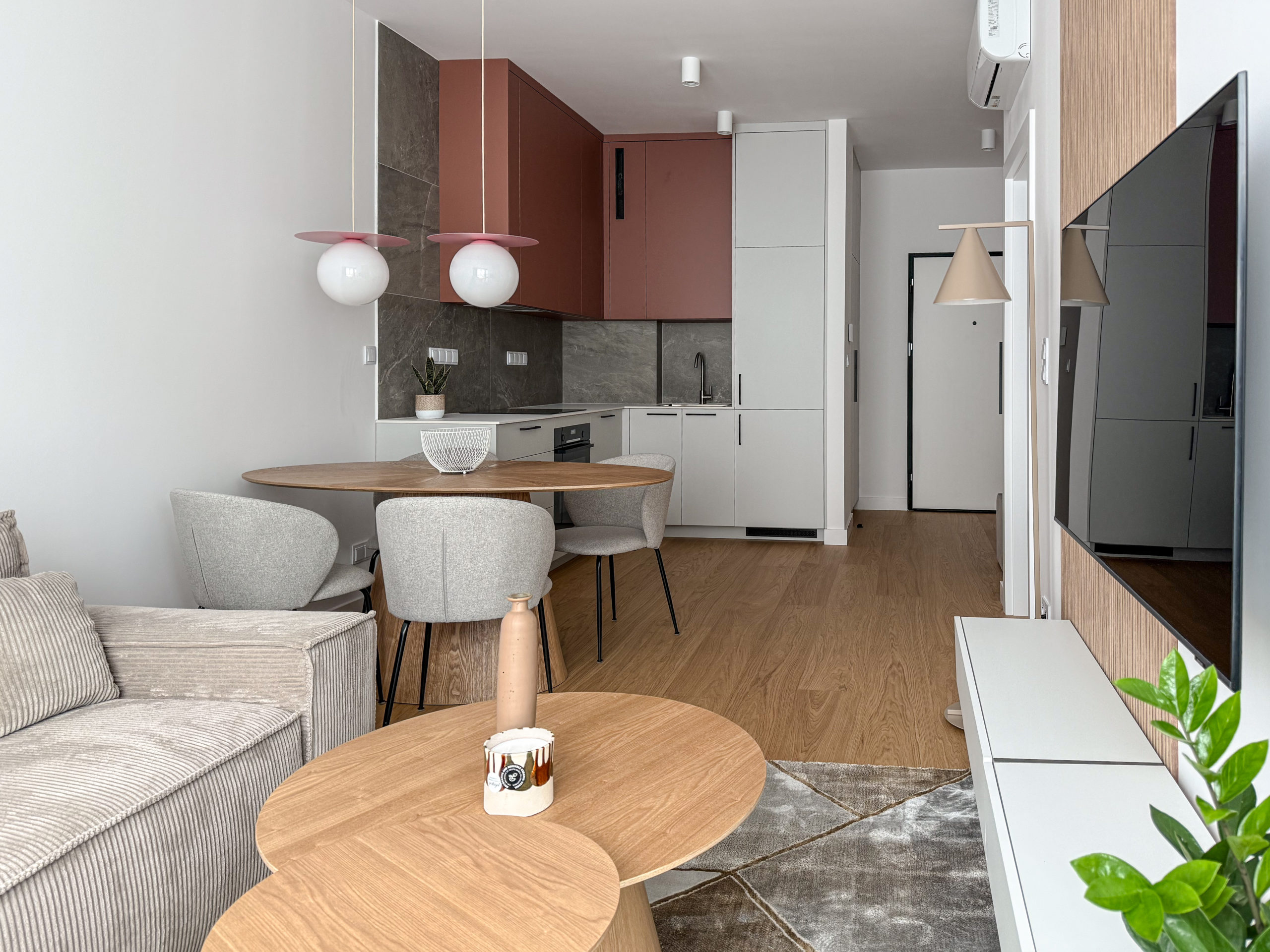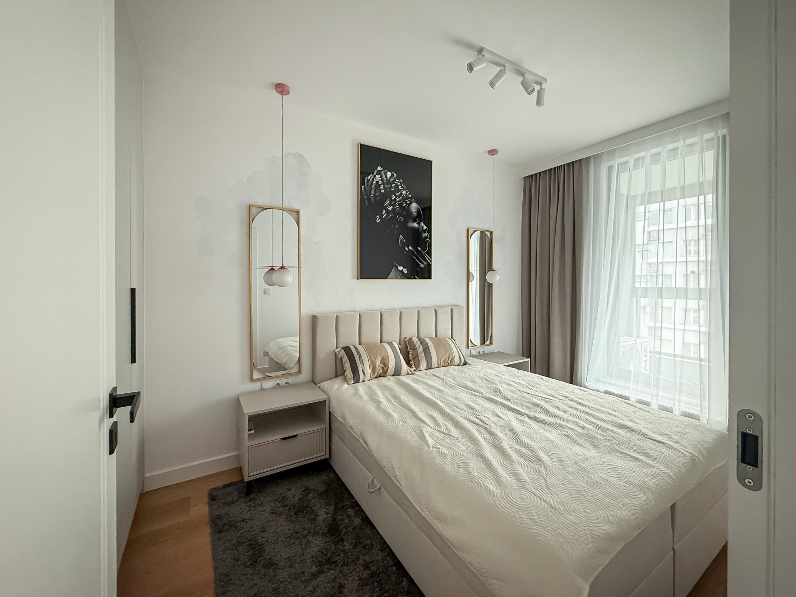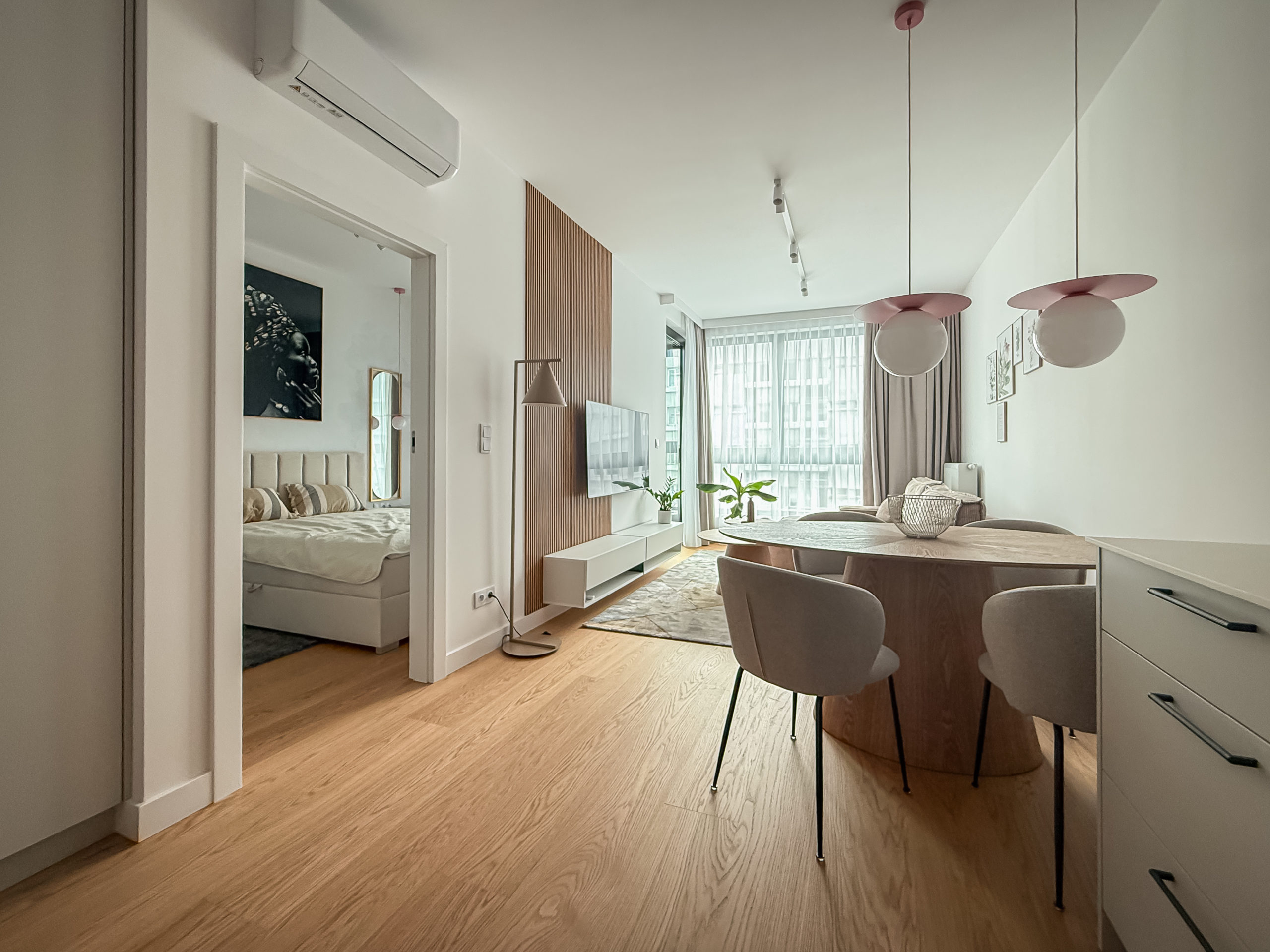 Mieszkanie dwupokojowe o powierzchni 41 m2 z balkonem znajdujące się na 12 piętrze nowoczesnego budynku Grzybowska 37. Mieszkanie zostało wyposażone w najwyższej jakości materiały (meble wykonane na zamówienie przez stolarza, wodoodporna podłoga z prawdziwego drewna, klimatyzacja, pralkosuszarka LG, pozostały sprzęt AGD marki Bosch: zmywarka, lodówka, piekarnik etc., telewizor Samsung QLED 55 cali). Mieszkanie składa się z 2 pokoi: sypialnia + salon z aneksem kuchennym. W sypialni znajduje się łóżko kontynentalne 160×200 cm oraz szafa w zabudowie. Salon został wyposażony w designerskie meble. W mieszkaniu znajduje się bardzo dużo miejsca do przechowywania dzięki wykonanym na zamówienie szafom w zabudowie. W holu budynku znajduje się portiernia, budynek jest monitorowany, a w części wspólnej jest pięknie zagospodarowany taras. Mieszkanie znajduje się w świetnej lokalizacji Śródmieście/Wola, w doskonałym punkcie komunikacyjnym.