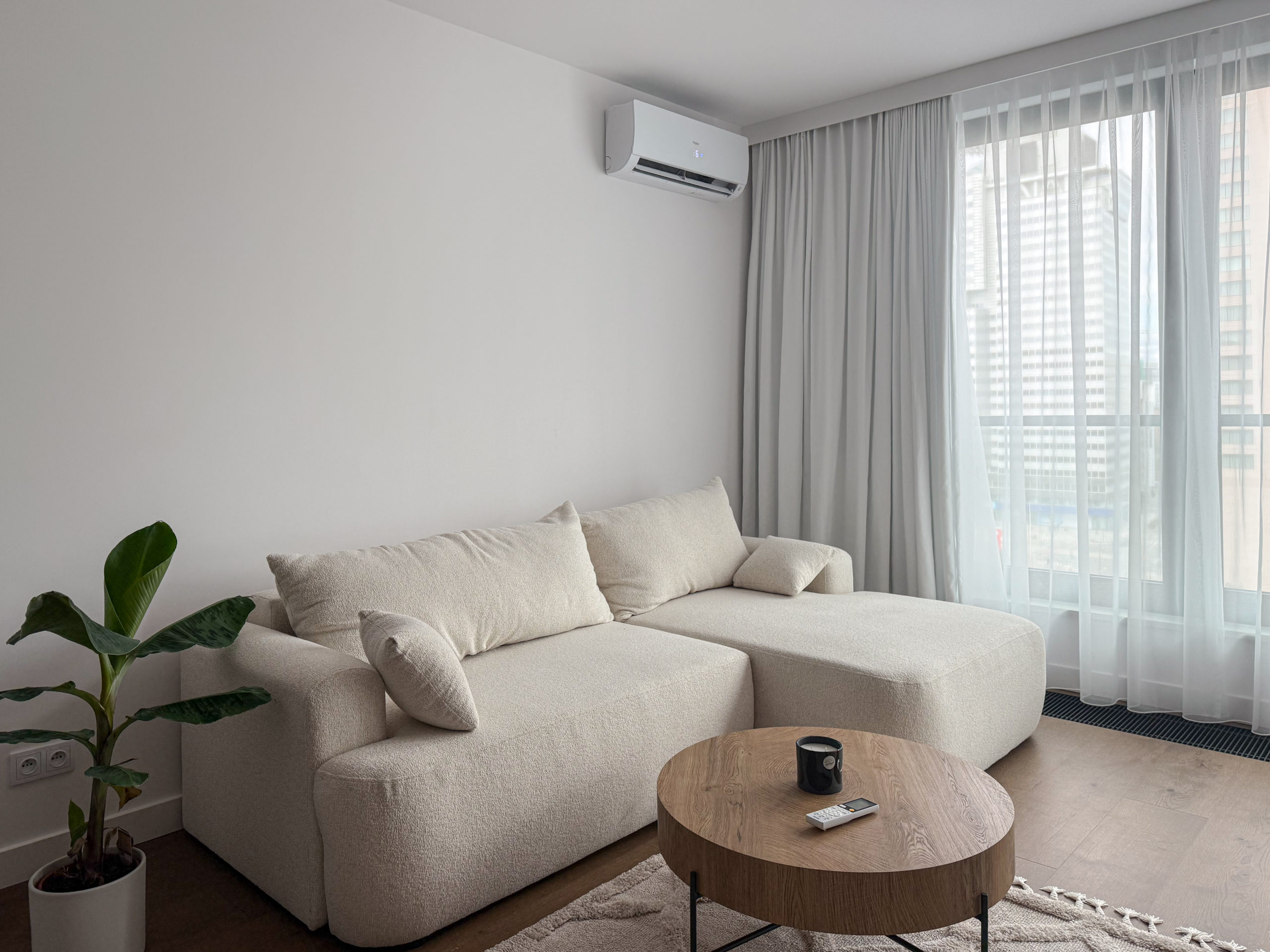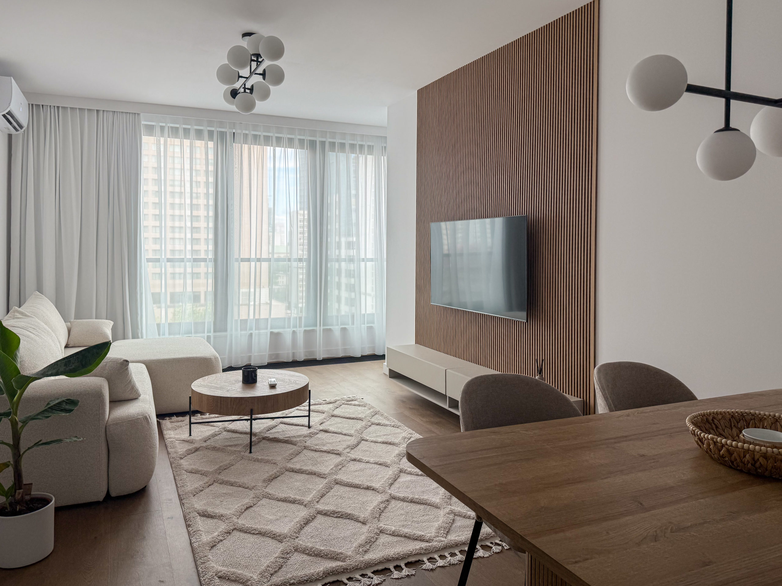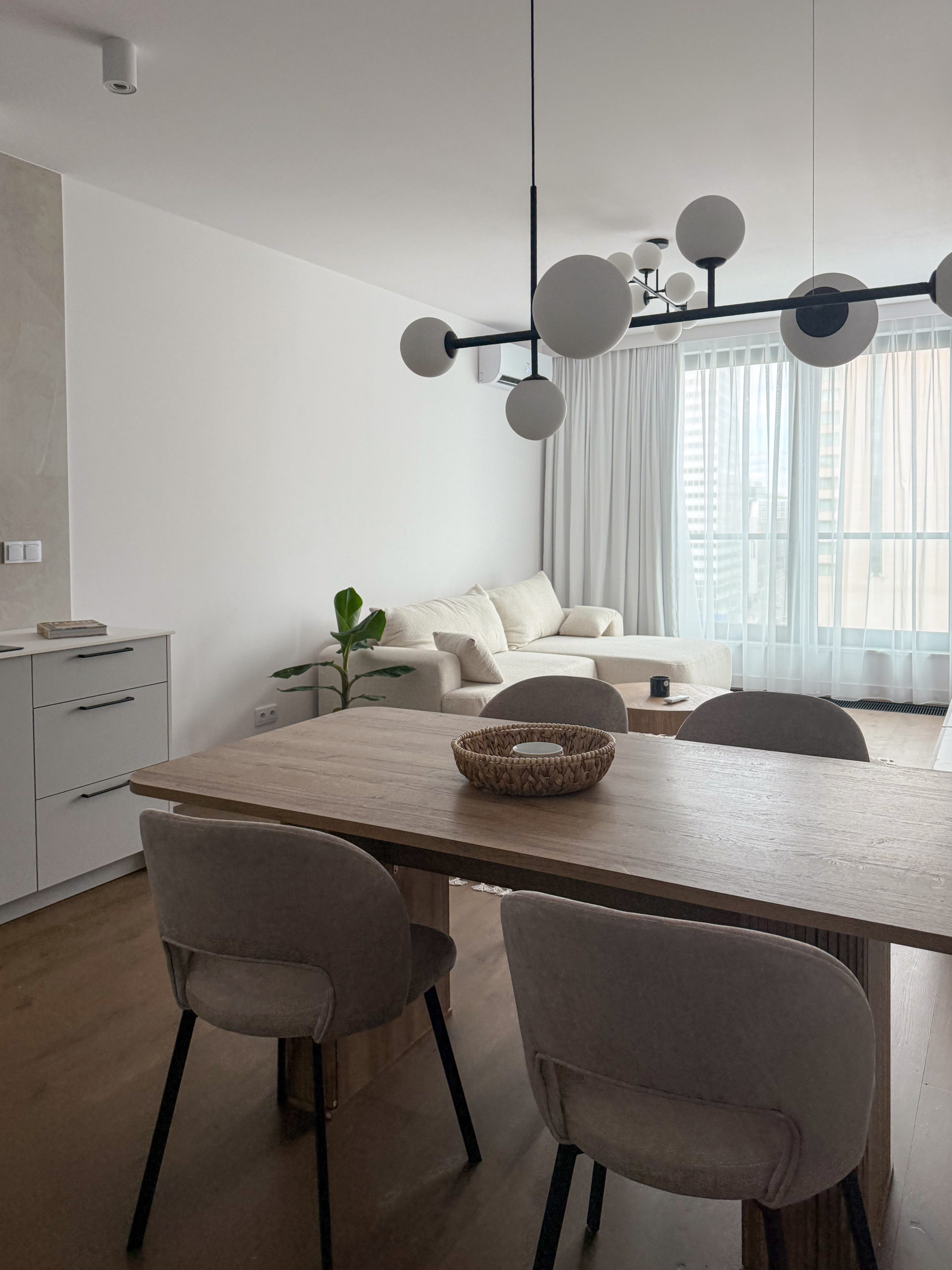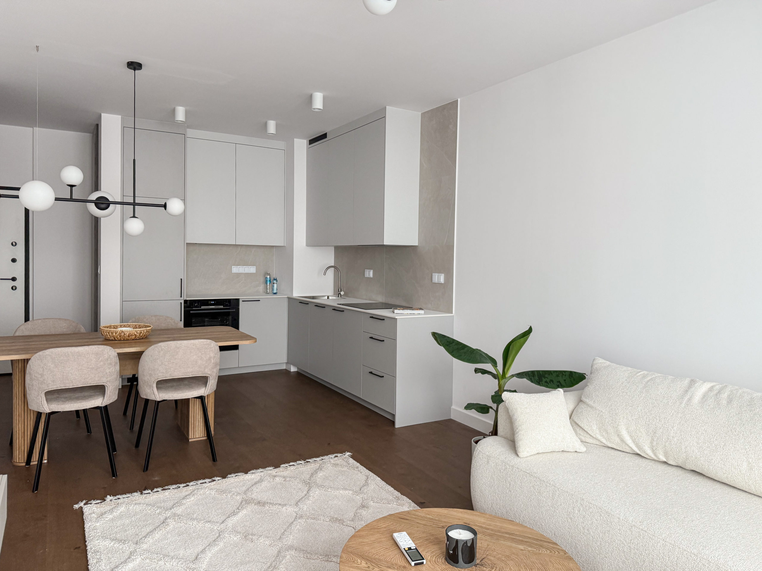 Mieszkanie zostało wyposażone w najwyższej jakości materiały (wszystkie meble wykonane na zamówienie przez stolarza, wodoodporna podłoga z prawdziwego drewna, klimatyzacja, pralkosuszarka LG, pozostały sprzęt AGD marki Bosch: zmywarka, lodówka, piekarnik etc., telewizor Samsung QLED 55 cali).