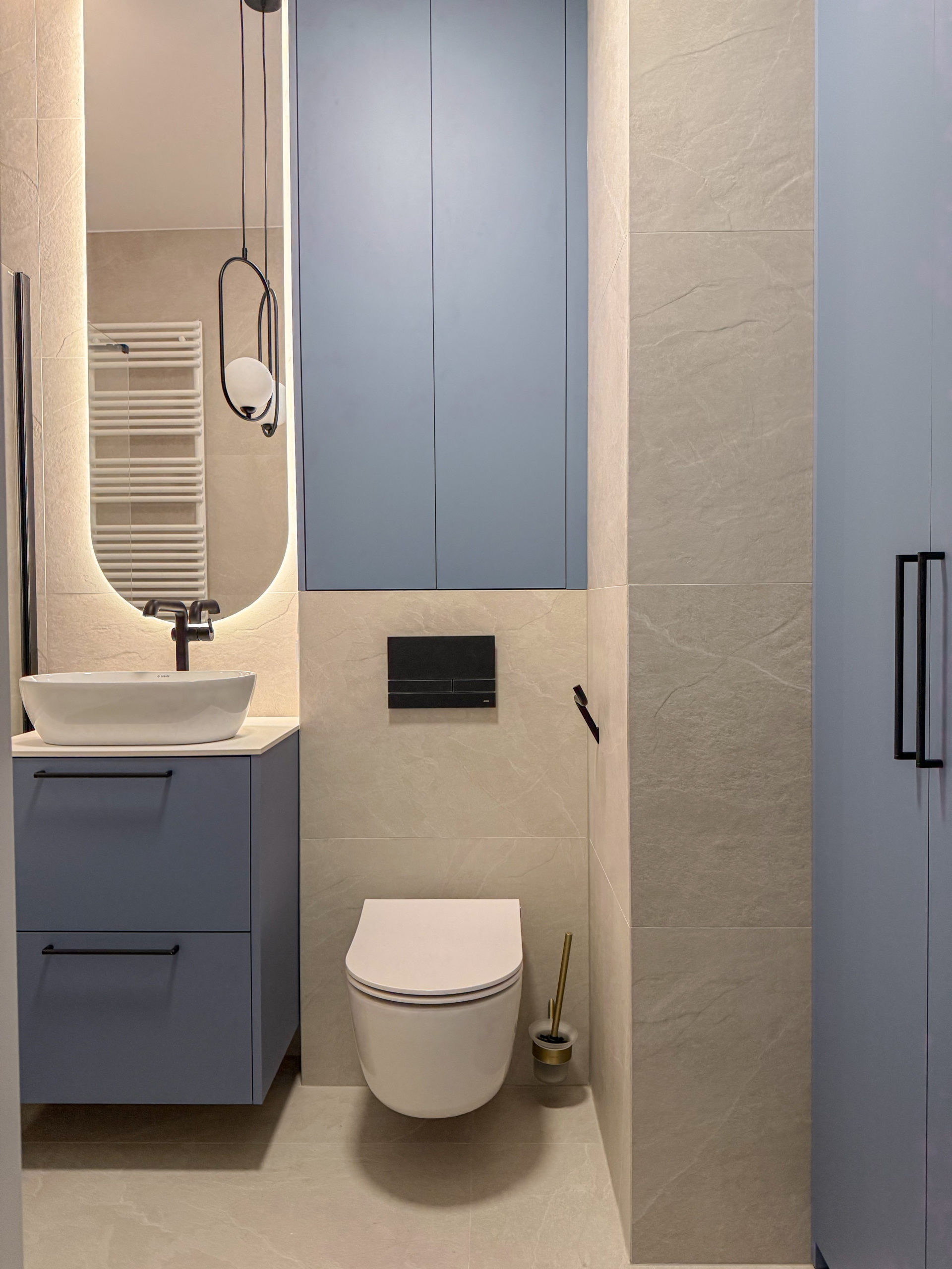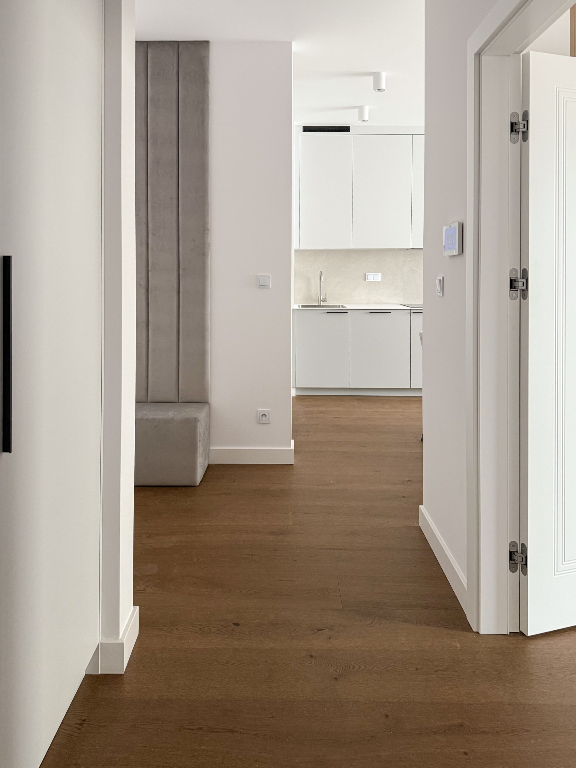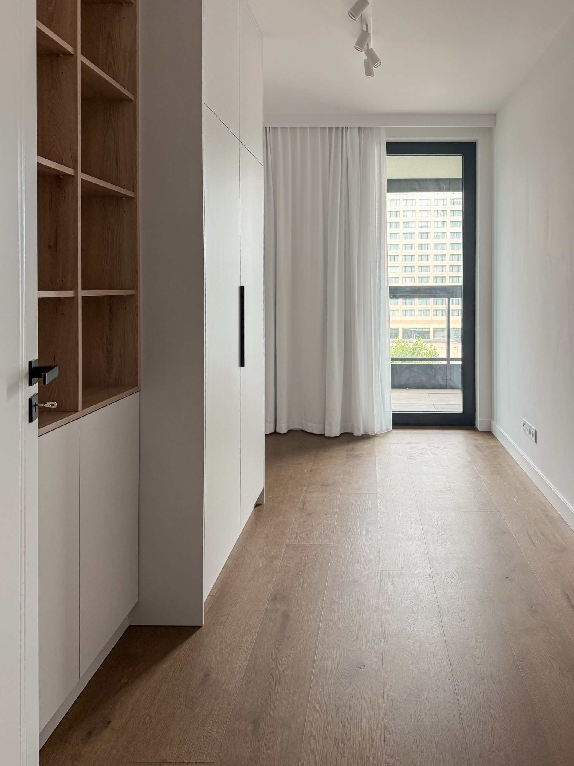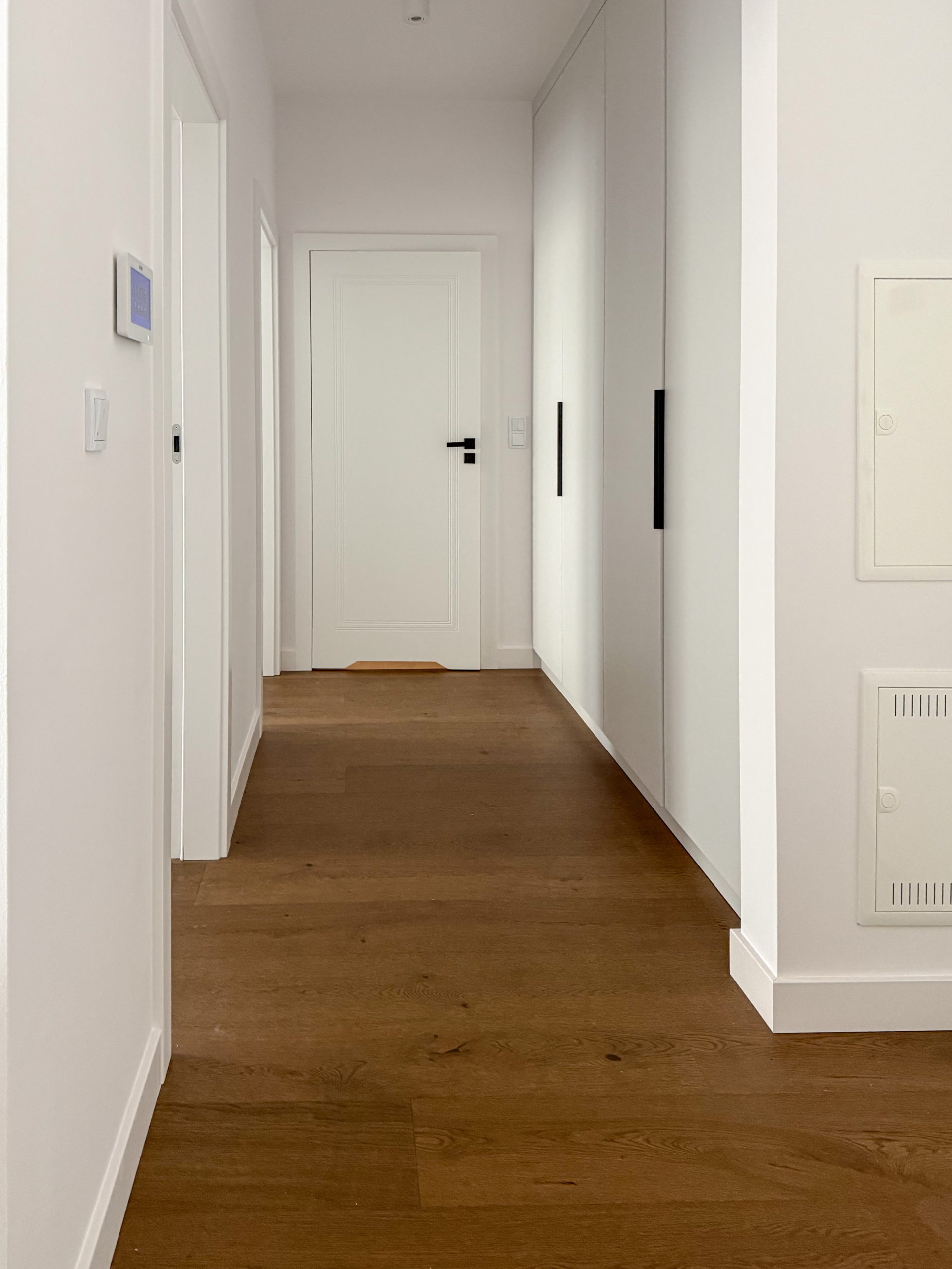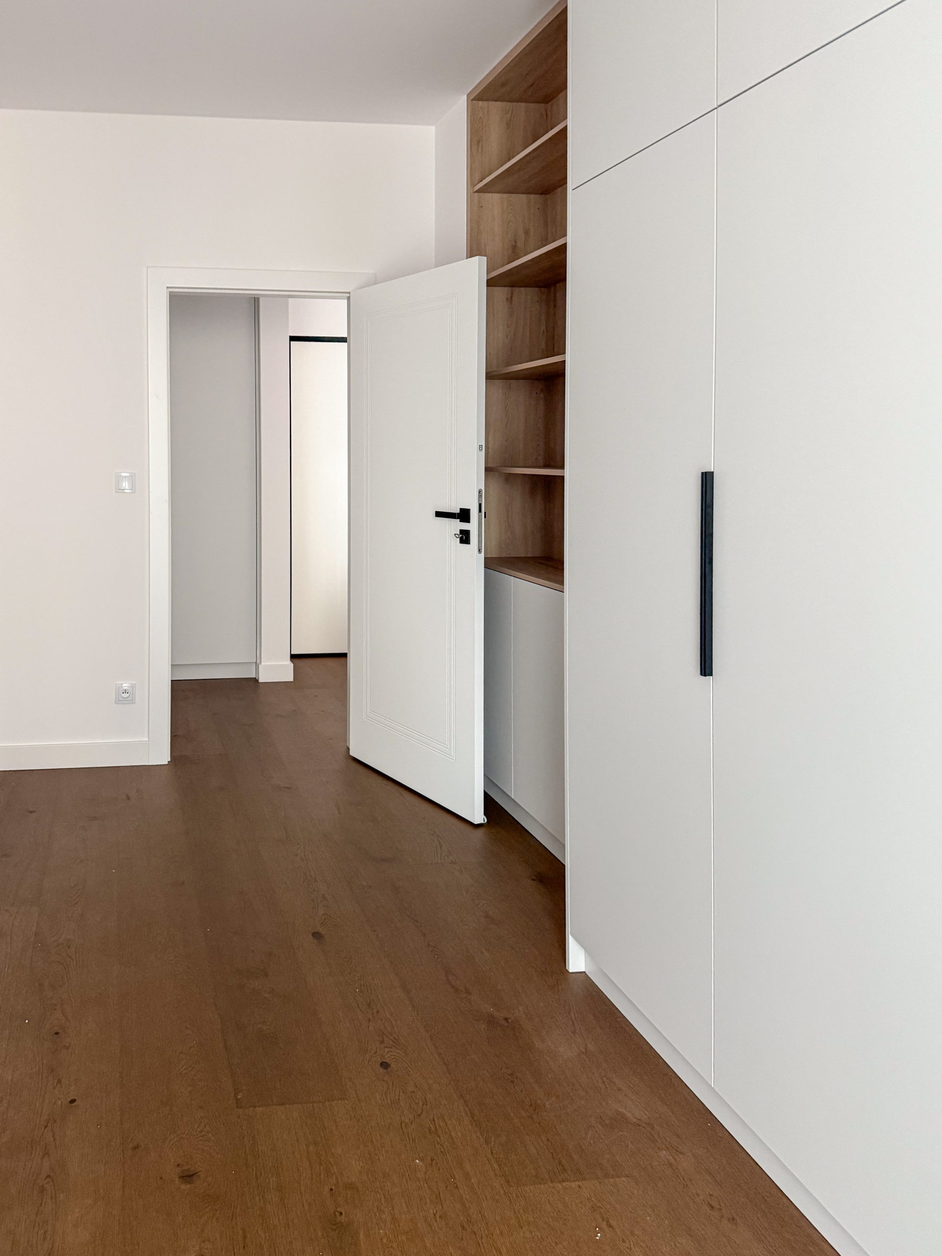 W mieszkaniu znajduje się bardzo dużo miejsca do przechowywania dzięki wykonanym na zamówienie szafom w zabudowie.